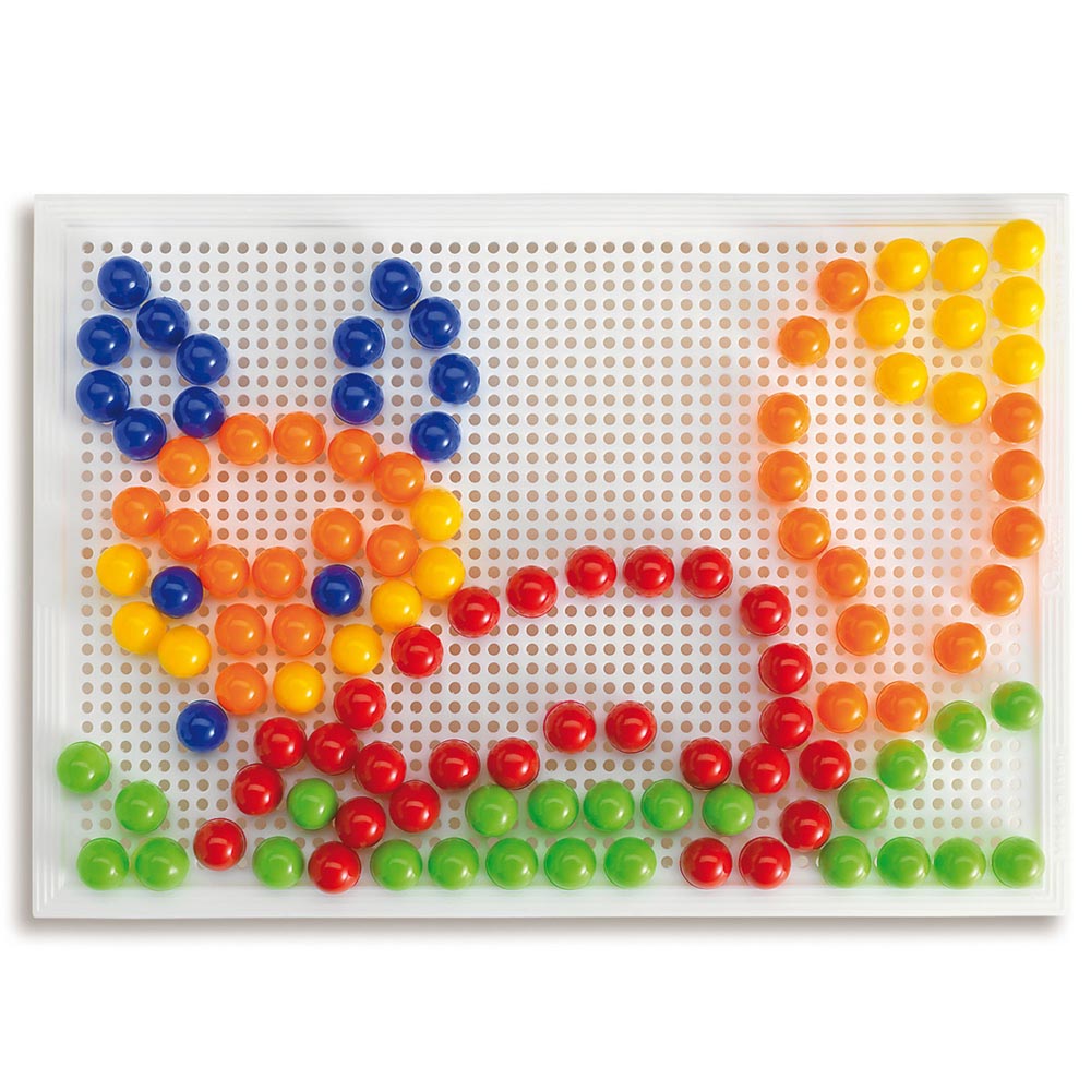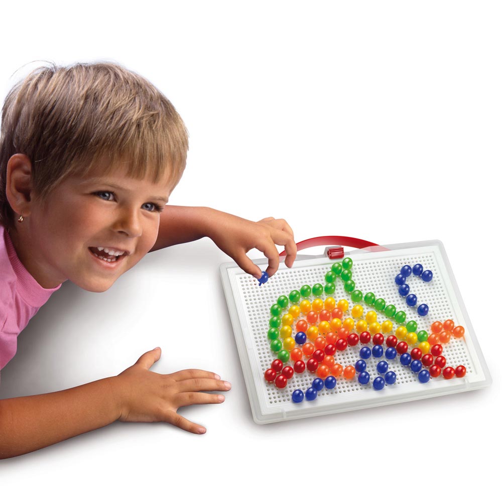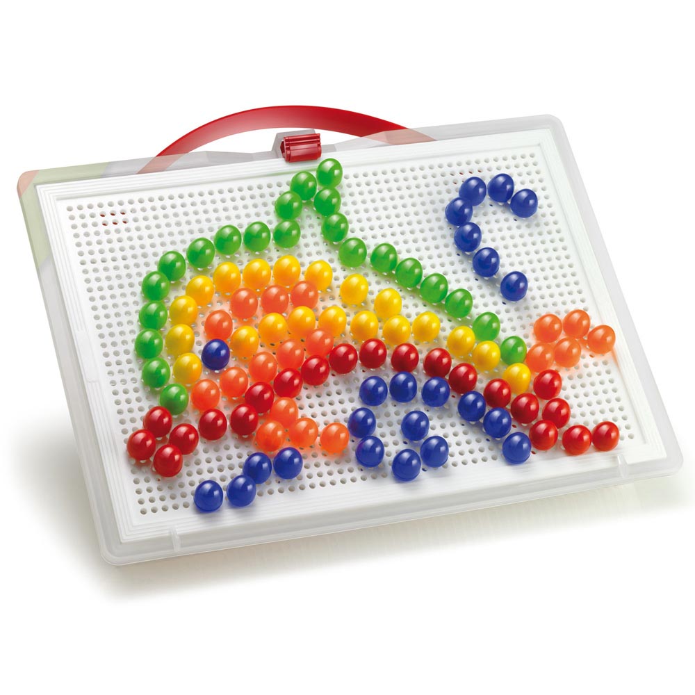 Mosaico portátil. Se pueden inventar diversos mosaicos o incluso se pueden copiar los ejemplos de la guía. Todas las piezas se guardan, ya que la tableta de encaje tiene también la función de tapa. El mango ayuda al transporte y a colgar el mosaico en la pared con el fin de decorar. De gran colorido y excelente calidad.