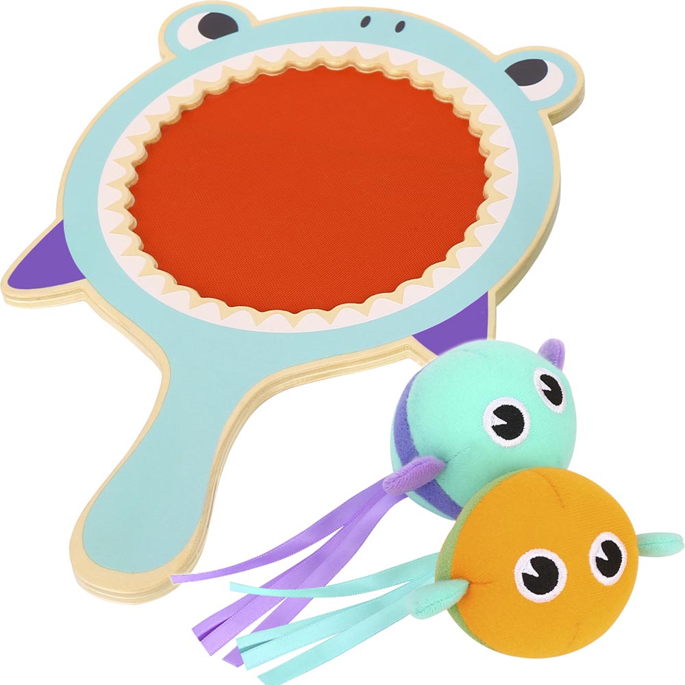 Un clásico juego para pasar horas de diversión. La paleta tiene forma de tiburón y la pelota es un divertido pez. ¡Lánzalos al aire y trata de atraparlos con la paleta! El material del pez se adhiere al círculo rojo en la pala. Adecuado para niños de 3 años en adelante.