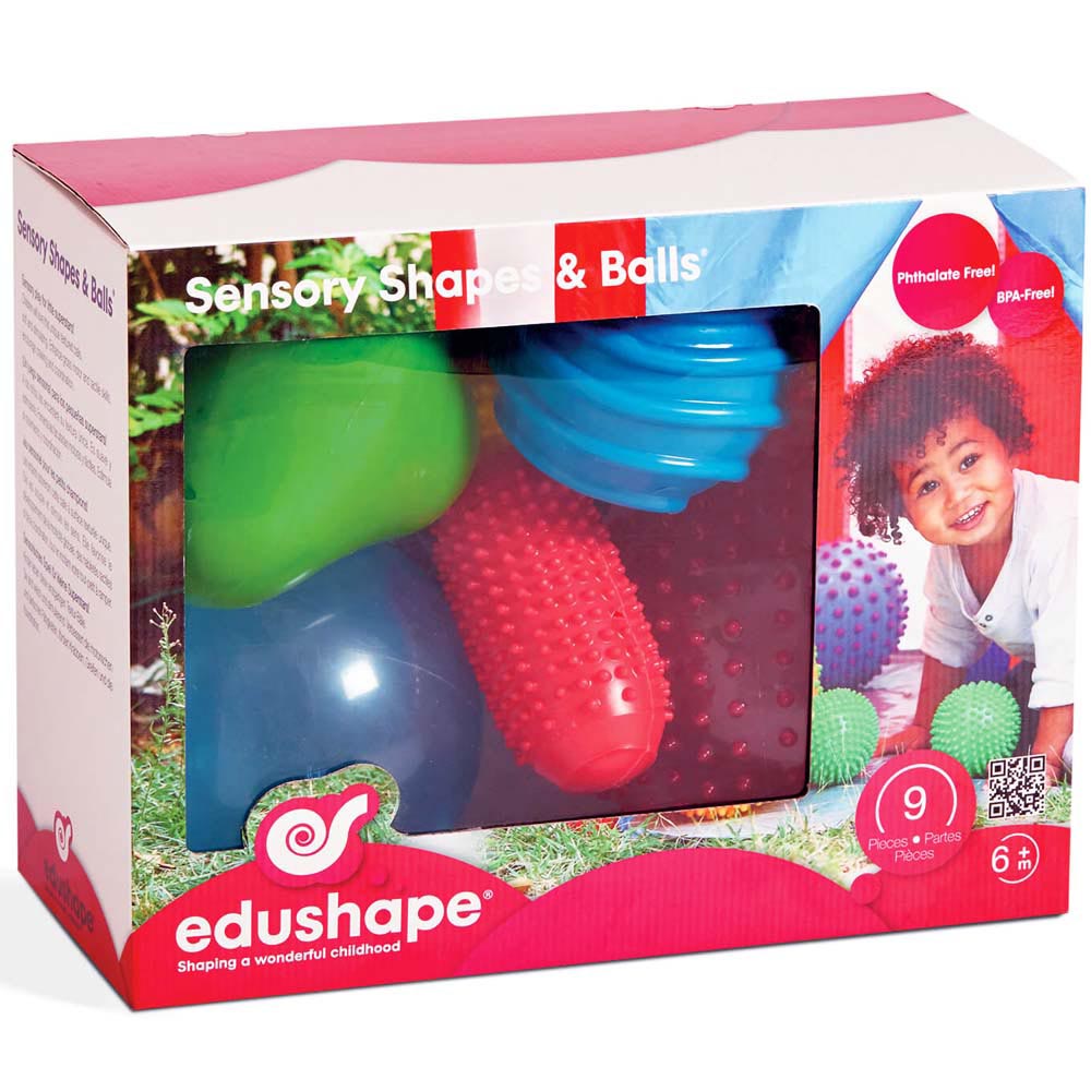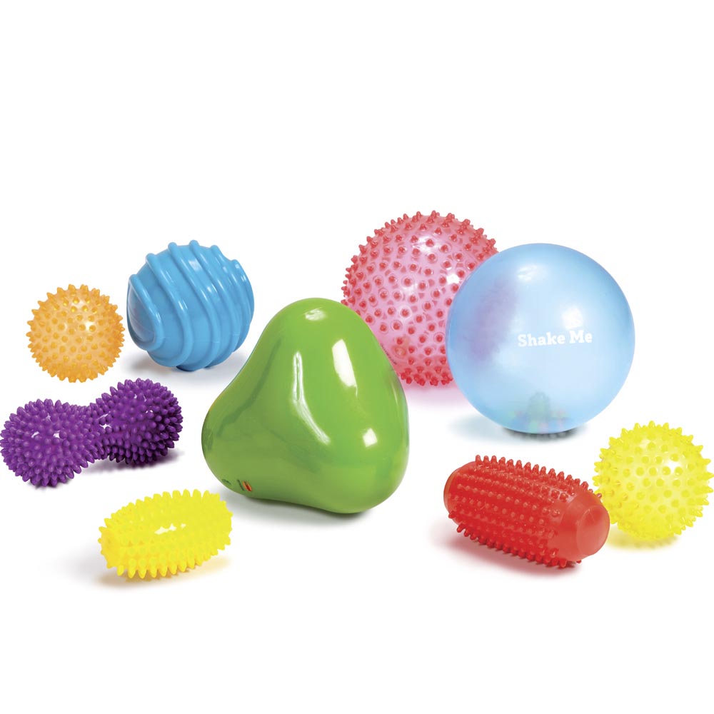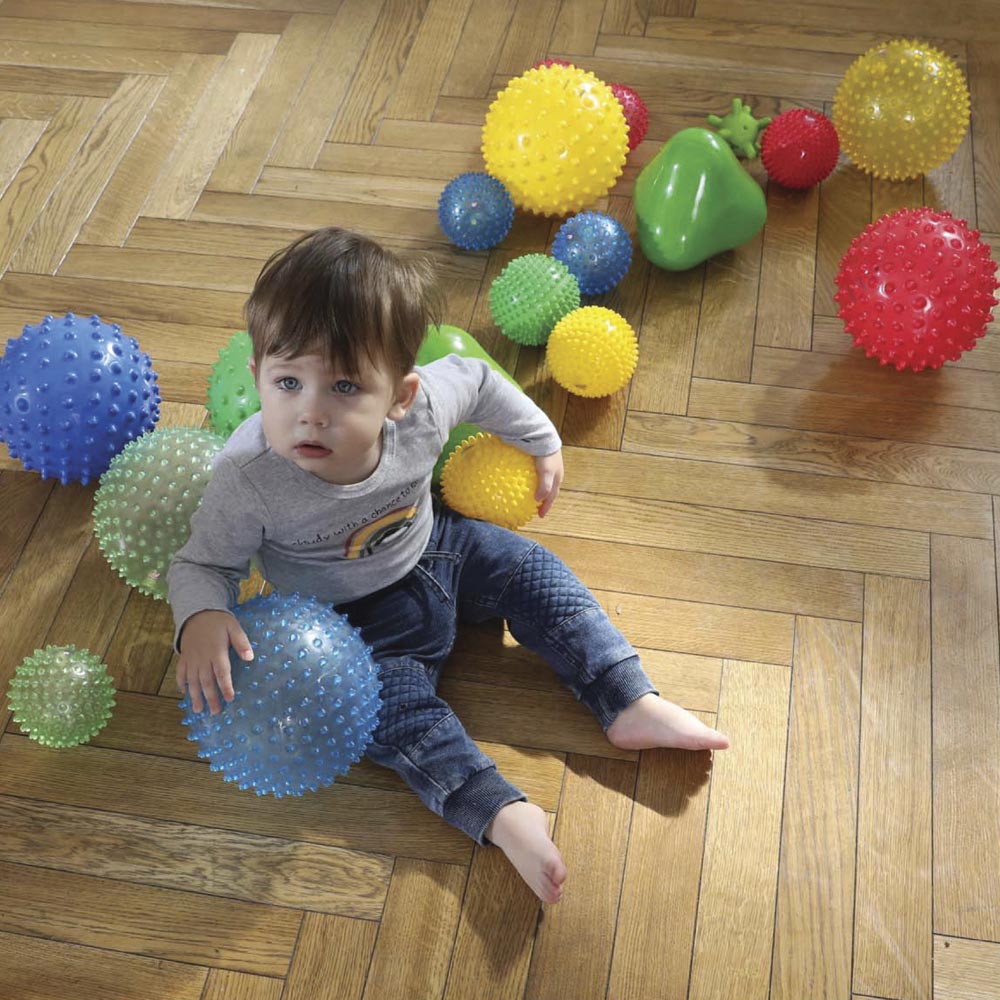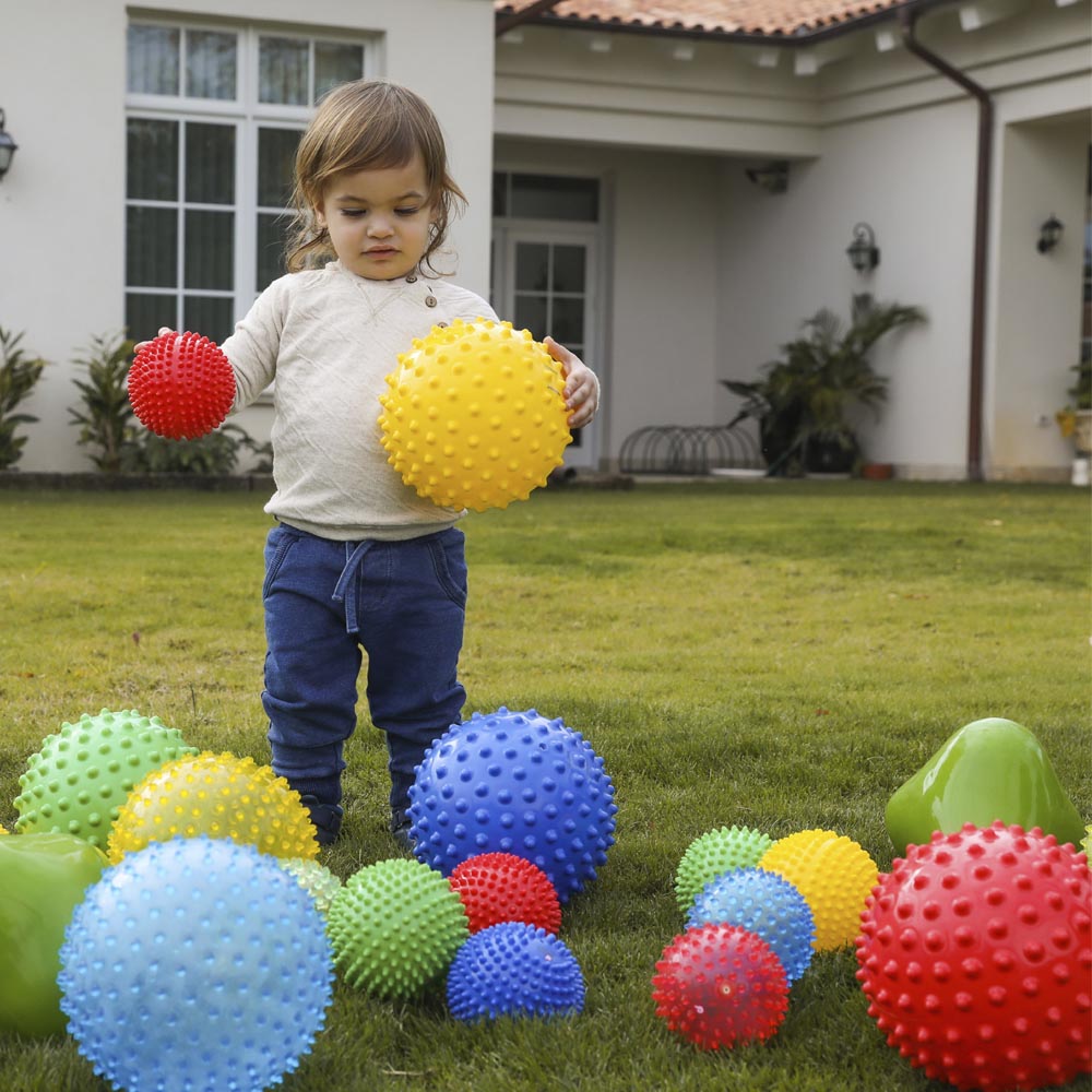 Set de 9 pelotas diferentes para el desarrollo sensorial que incluye bolas de formas, tamaños y textura únicos. Pelota triangulo verde 13 cm, pelota roja erizo 18 cm, 2 pelotas erizos naranja y amarilla 10 cm, pelota maní morada 6,5 cm, 2 pelotas óvalos erizo amarilla y roja 7,5 cm, pelota celeste con pelotitas al interior arcoíris 18 cm y pelota celeste con relieve lenta 13 cm.