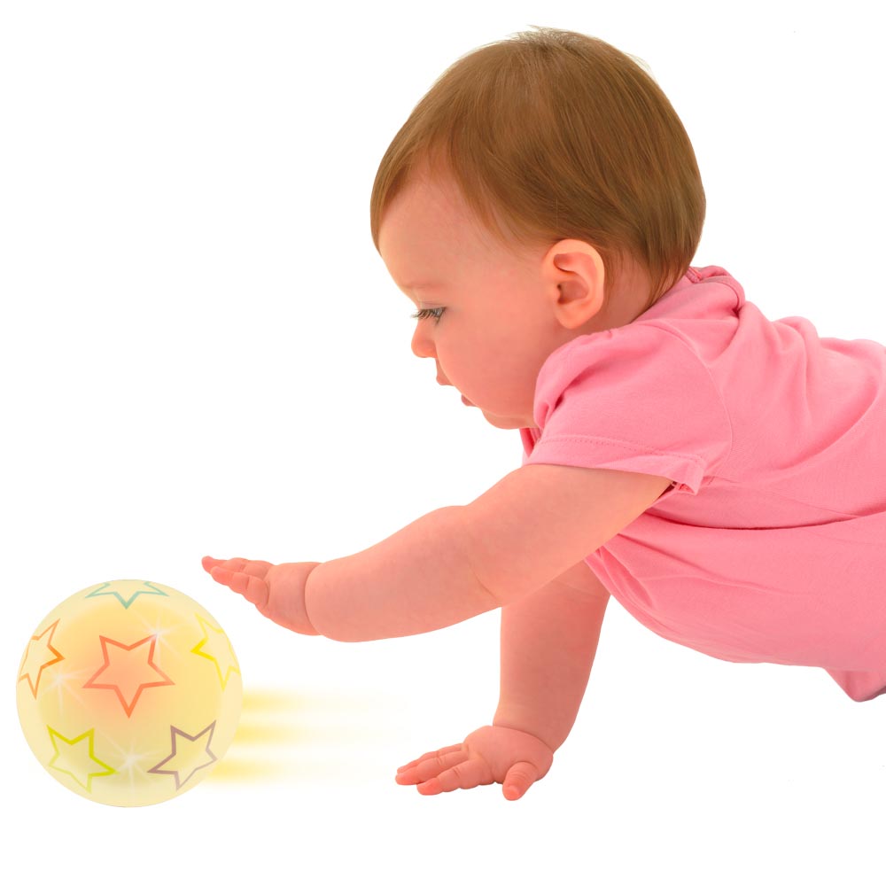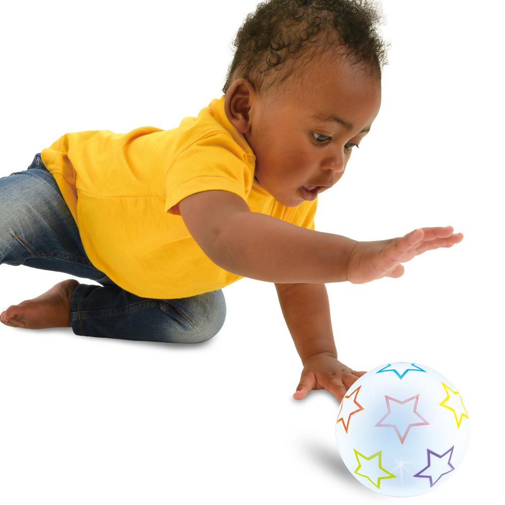 Una pelota motorizada que cambia de color para que el bebe la persiga mientras rueda, luego se detiene y cambia de dirección. La bola se ilumina y los colores cambian a medida que se mueven. Los bebes estarán cautivados por el movimiento aleatorio y sus colores. Con baterías incluidas. Tamaño pelota 10, 5 cm de diámetro.