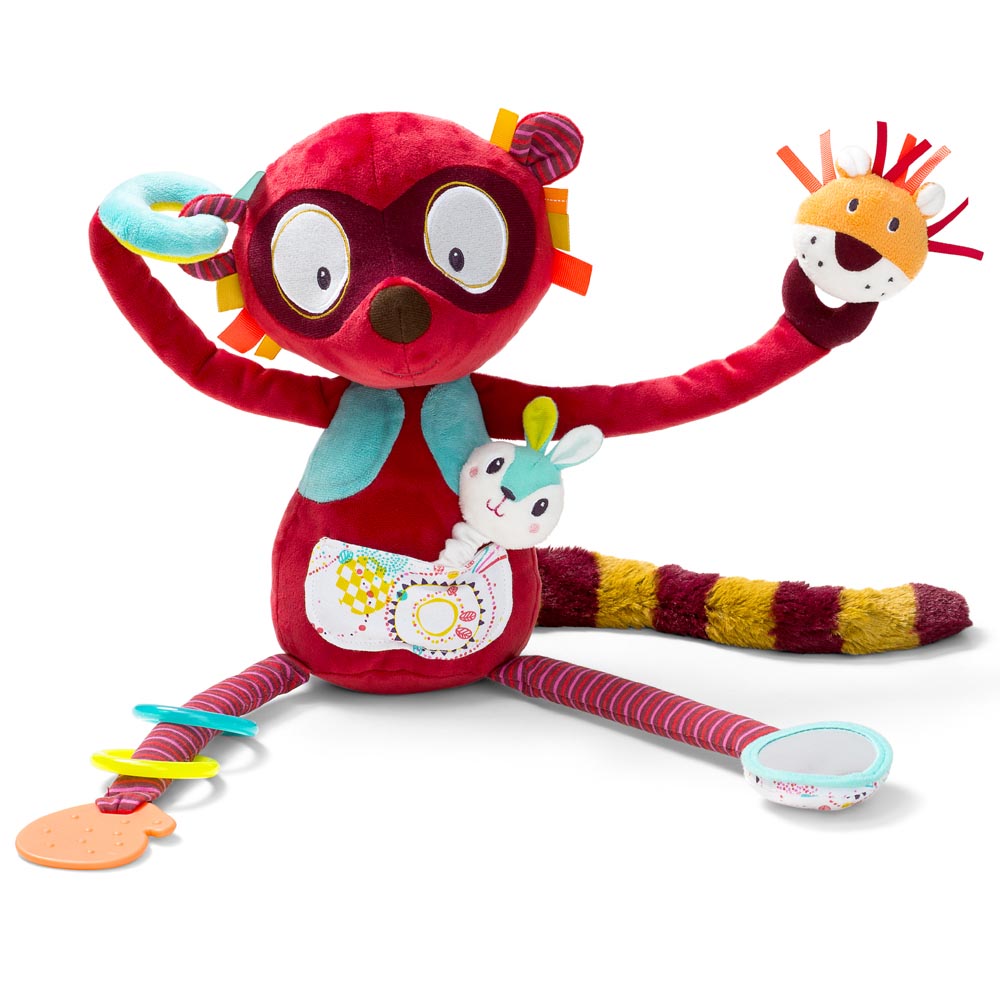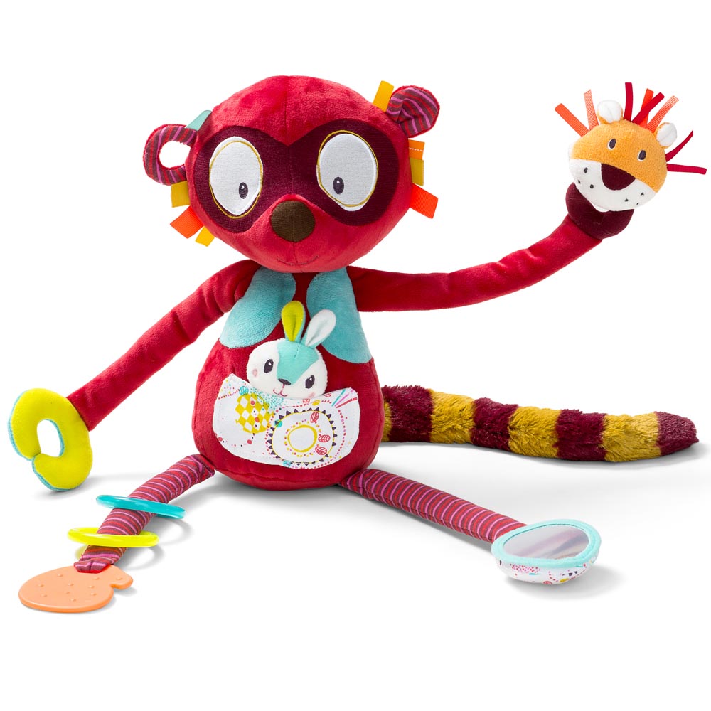 Es muy entretenido jugar con George el lémur. Una pata para masticar, espejo, anillos y muchas actividades para disfrutar. Peluche liviano, suave y blando de bellísimo diseño.