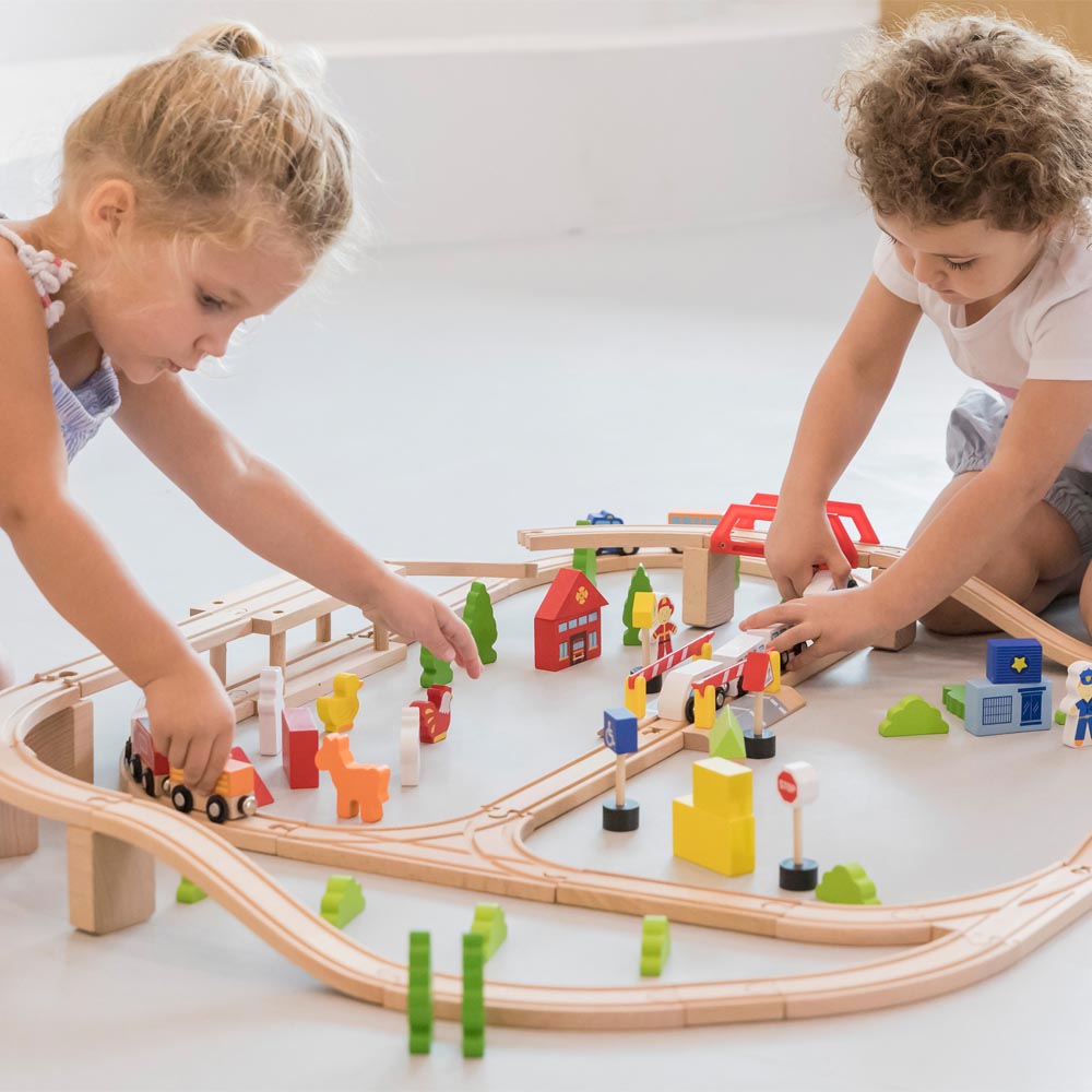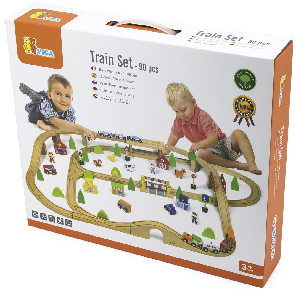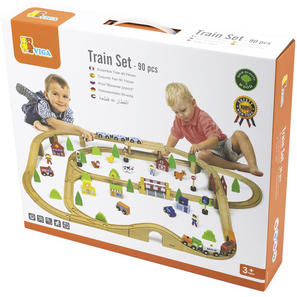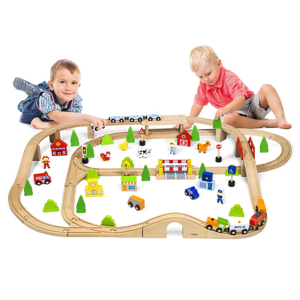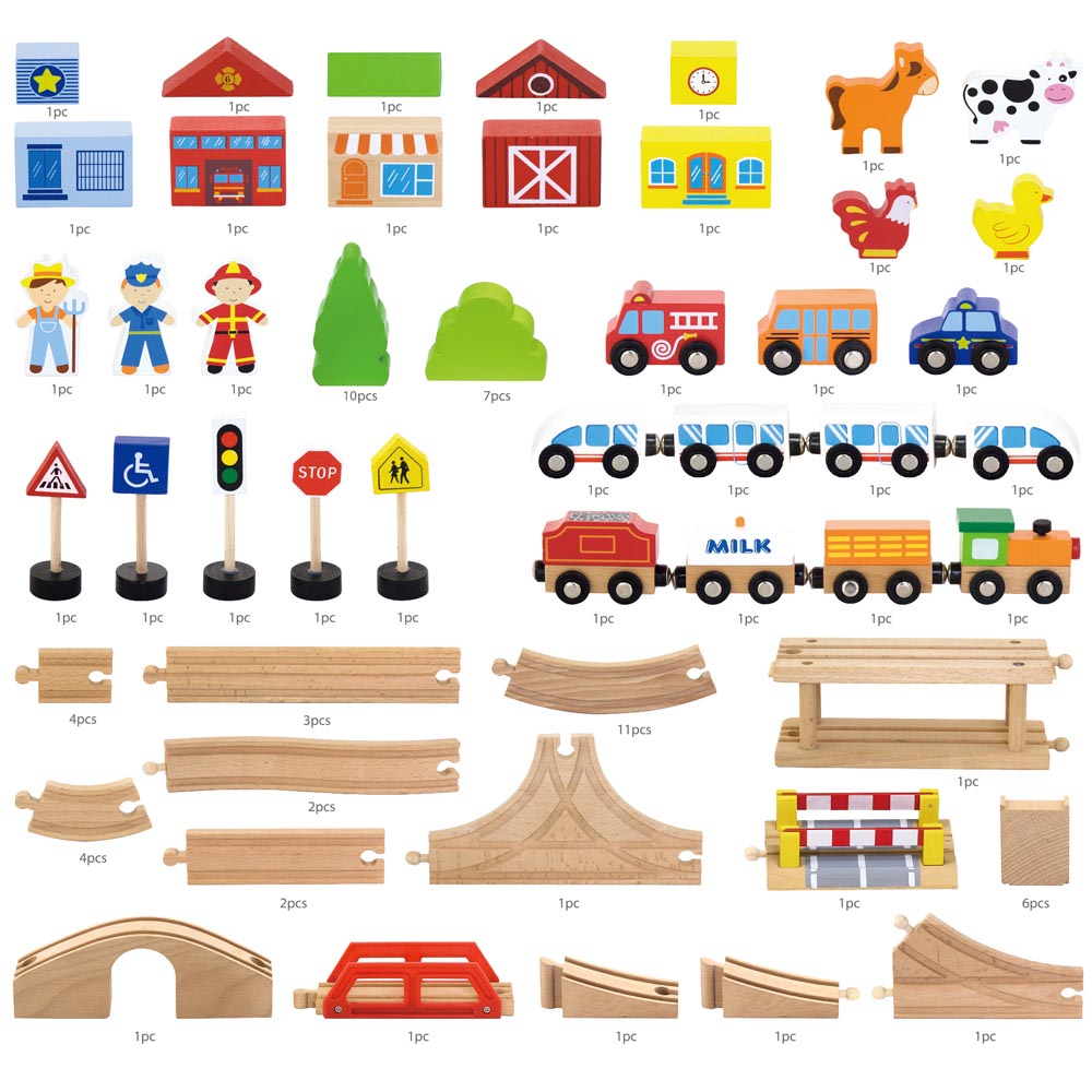 Pista de trenes con 90 pz de tren. Incluye tren moderno, un tren de carga, bloques de campo, animales, arboles, ciudad, estación de policía, escuela, tienda, automóviles, figuras, señales de trafico y rieles de madera de haya de alta calidad.