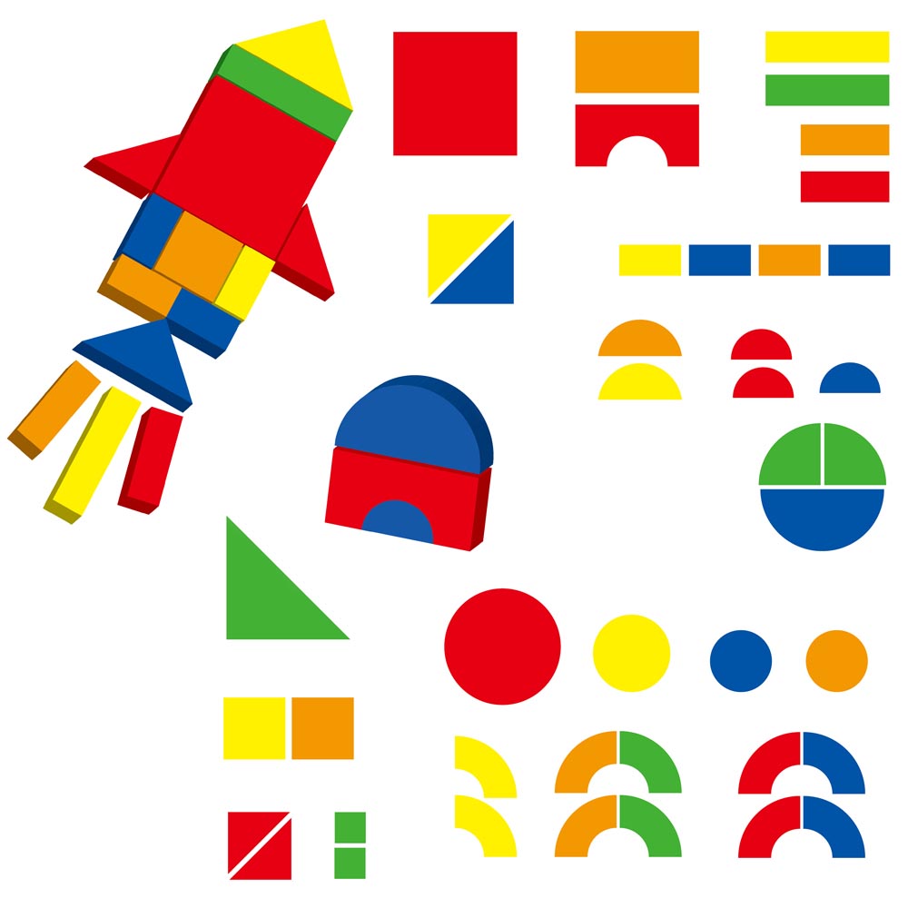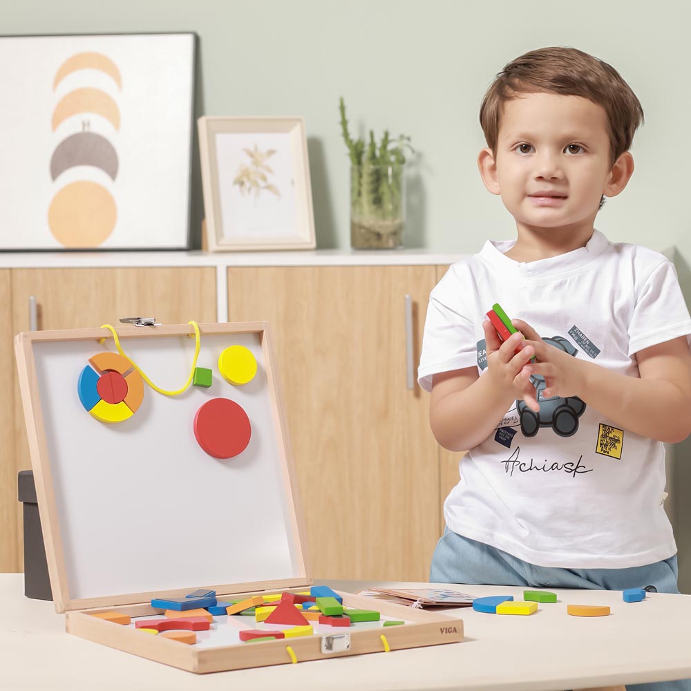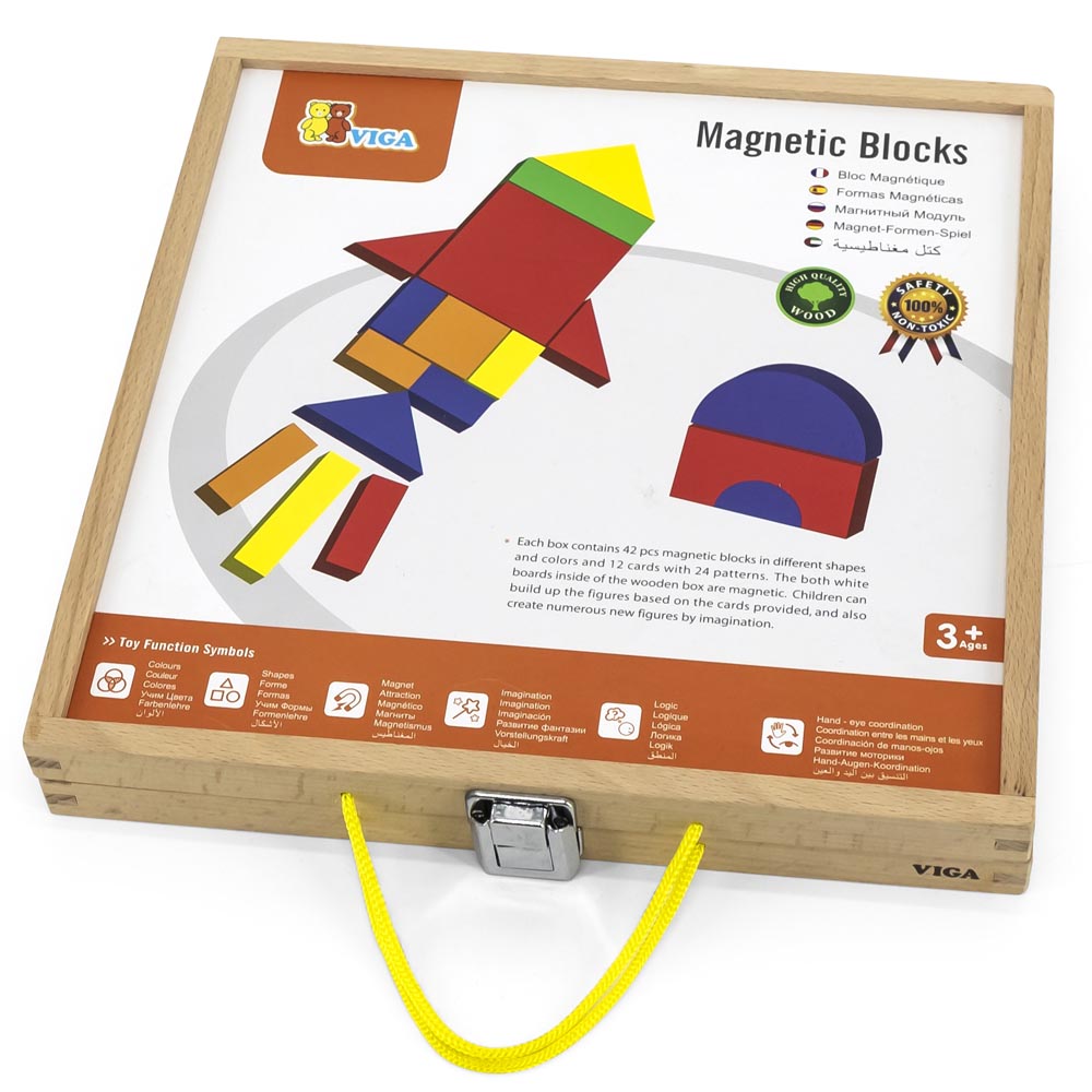 Maleta de madera que contiene 42 pz. De madera magnéticas en diferentes formas y colores, mas 12 tarjetas con 24 patrones. Los tableros al interior de la maleta son magnéticos. Los niños pueden construir según las tarjetas o crear según su imaginación.