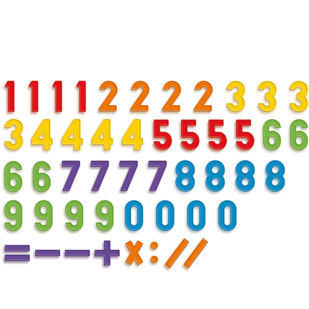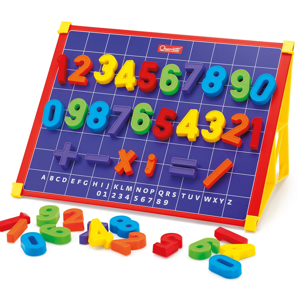 Pizarra magnética (23 x 29 cm) de doble cara, por un lado blanca cuadriculada para escribir con plumón (no incluido) y por el otro lado azul cuadriculada imantada para pegar los imanes, 2 cajitas de rejilla con tapa para guardar los imanes (21,5 x 5 x 5 cm), 2 atriles pequeños para inclinar la pizarra y 48 números imantados (3,5 x 2,5 x 1 cm). Excelente juego educativo que desarrolla la creatividad y el aprendizaje.