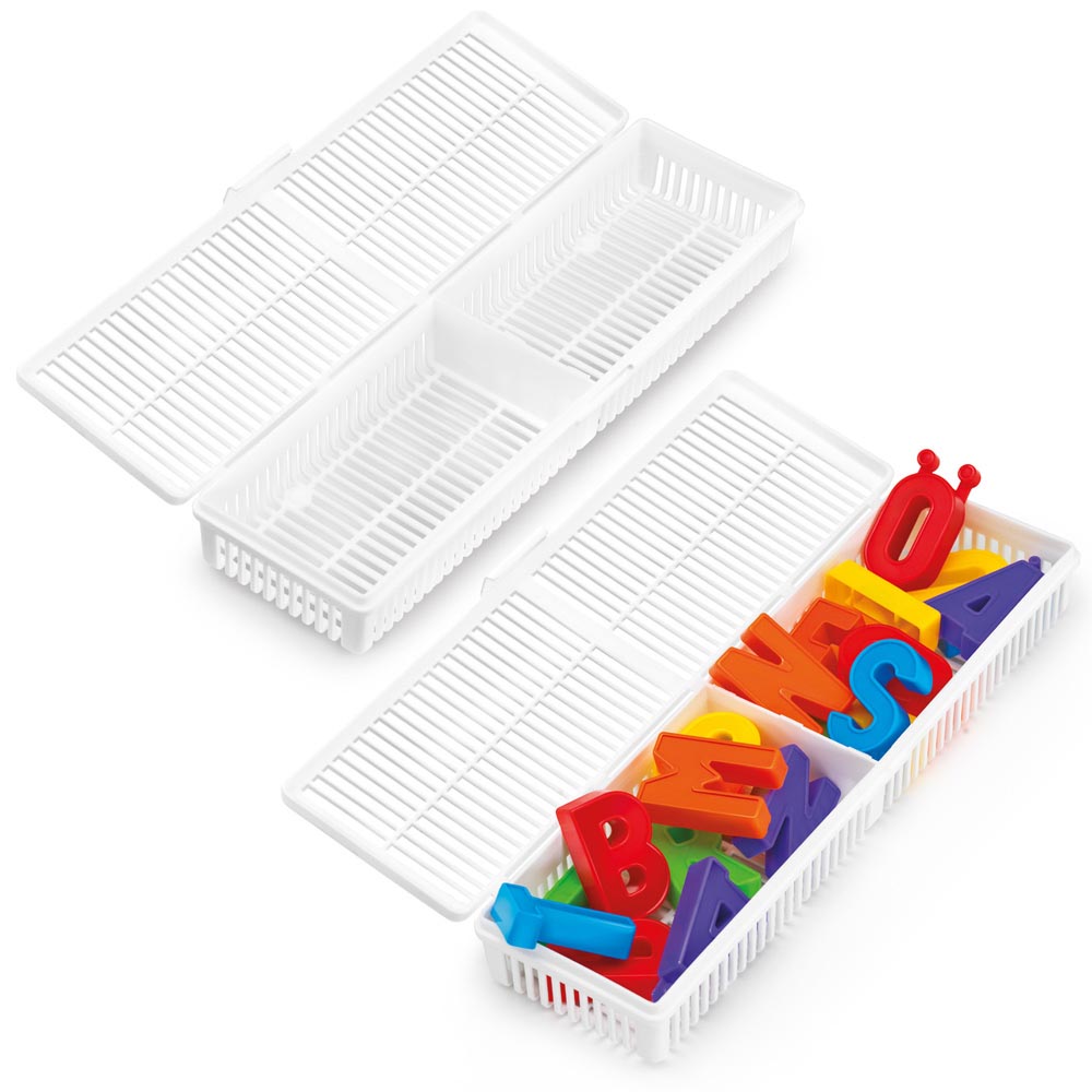 Pizarra magnética (23 x 29 cm) de doble cara, por un lado blanca cuadriculada para escribir con plumón (no incluido) y por el otro lado azul cuadriculada imantada para pegar los imanes, 2 cajitas de rejilla con tapa para guardar los imanes (21,5 x 5 x 5 cm), 2 atriles pequeños para inclinar la pizarra y 48 letras imantadas (3,5 x 2,5 x 1 cm). Excelente juego educativo que desarrolla la creatividad y el aprendizaje.