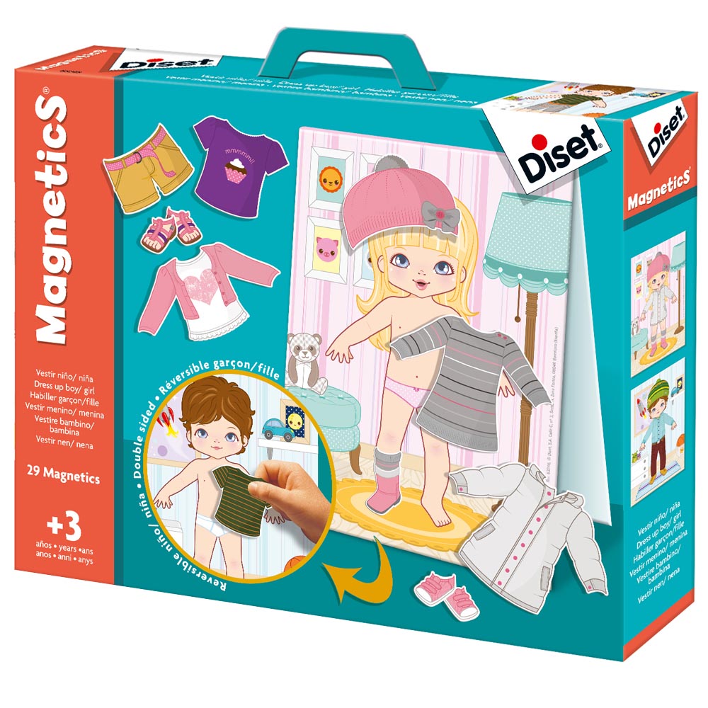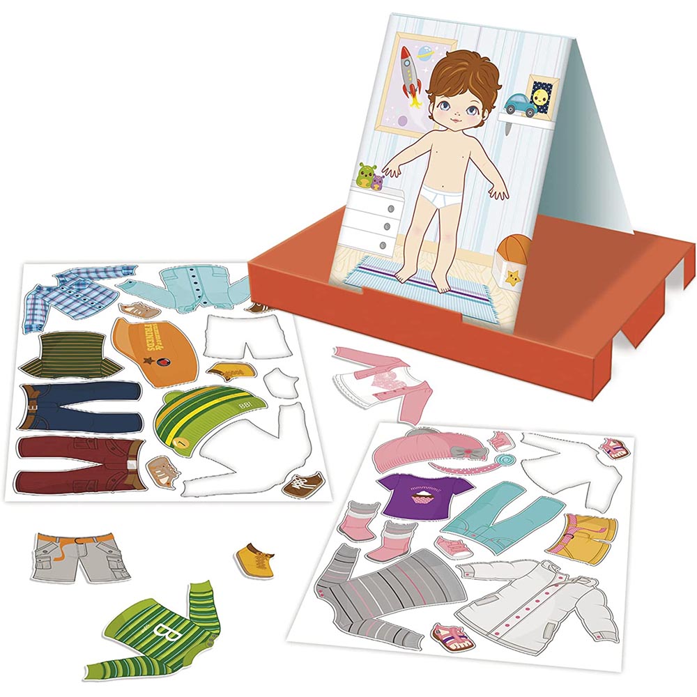 Pizarra magnética doble cara con temática de niños y niñas, junto con 2 láminas que contienen un total de 29 piezas magnéticas para vestir y combinar con diferentes conjuntos, como gorros, pantalones, camisetas, zapatos, y más. Este entretenido juego es tanto divertido como educativo, ya que enseña a los niños sobre las diferentes prendas que usan los niños y las niñas.