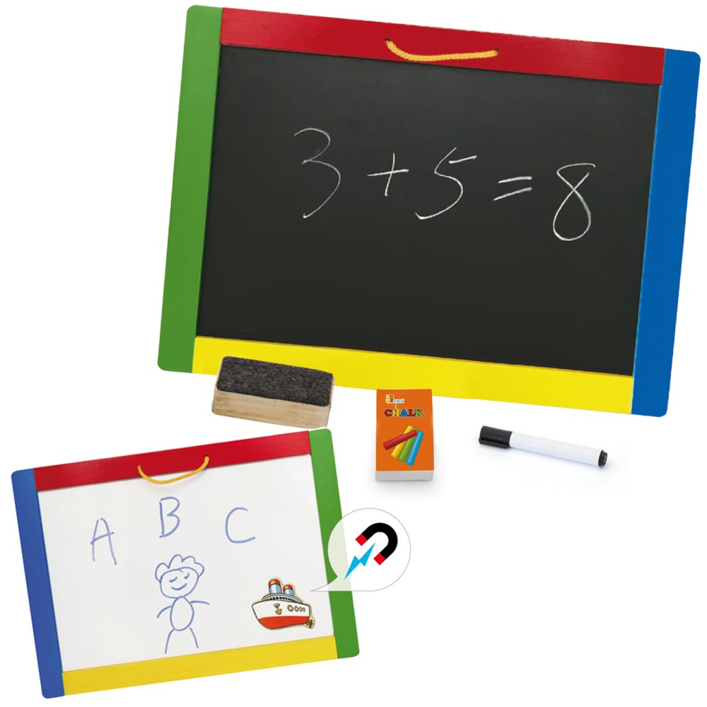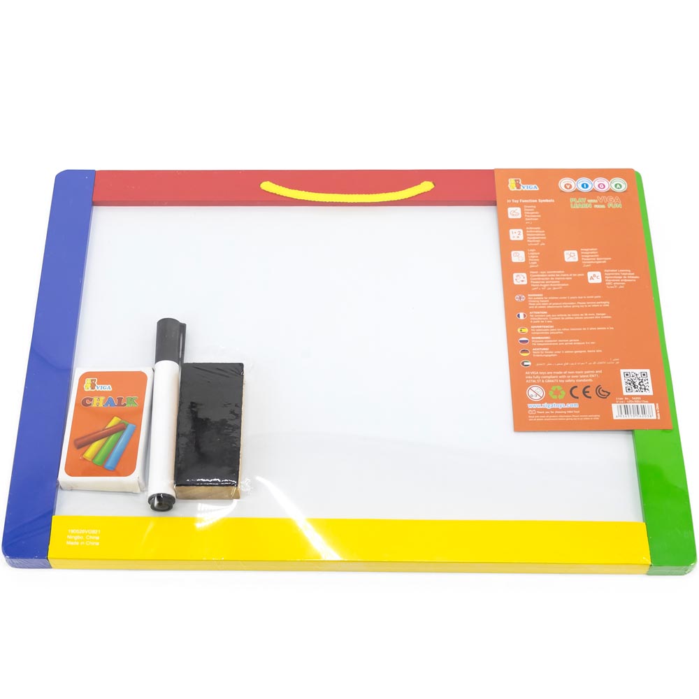 Pizarra doble de tiza y tablero blanco magnético. Incluye plumón, tizas y borrador.