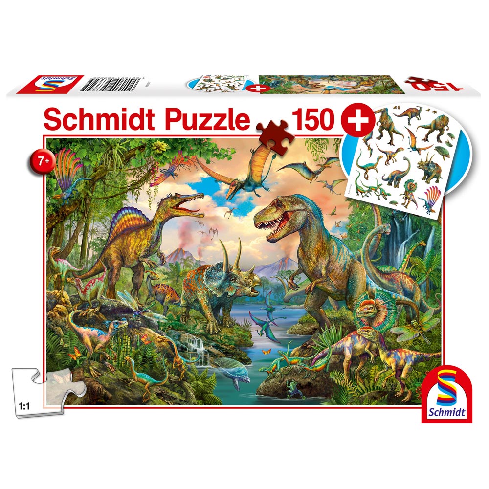 Divertido puzle de 150 piezas con hermosas ilustraciones. Incluye tatuajes de dinosaurios de regalo. Recomendado a partir de 6 años. Medidas del puzle armado 43,2 x 29,1 cm.