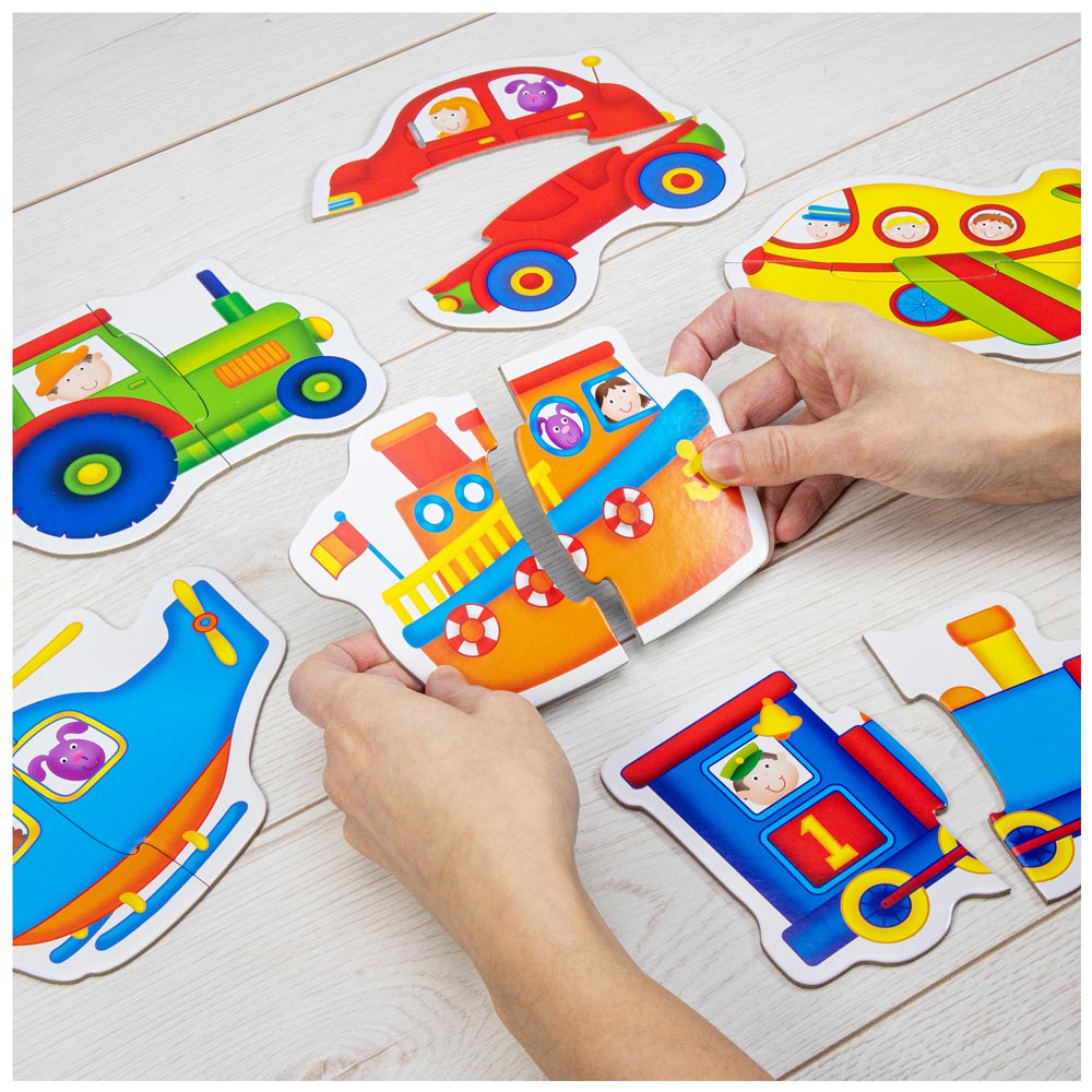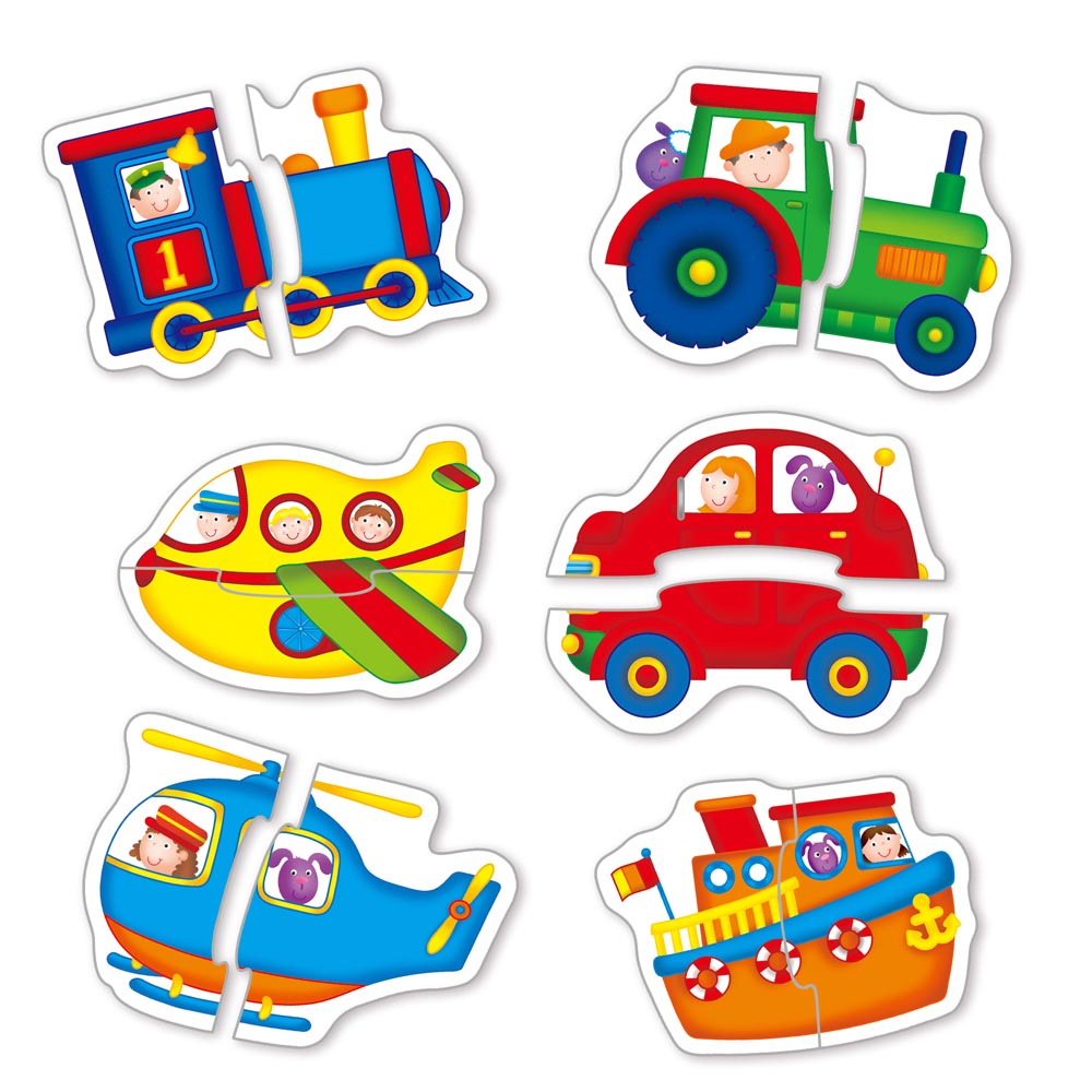 Puzle de 6 figuras de transportes con 2 piezas por cada una. De fácil ensamblaje para niños pequeños. Desde 18m.