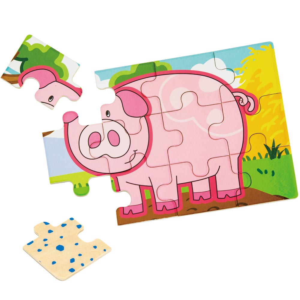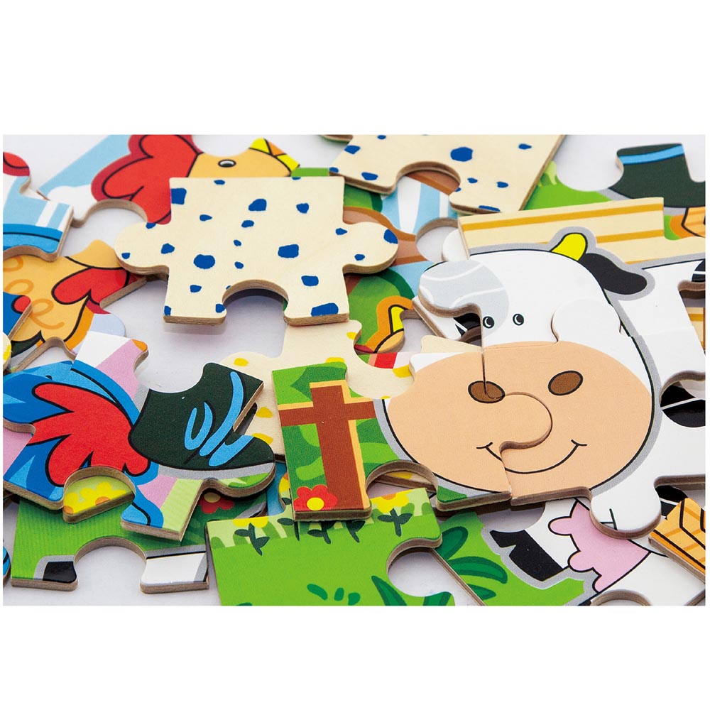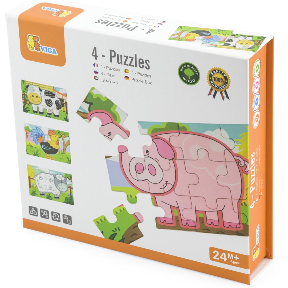 Caja con 48 piezas que contiene 4 puzles individuales (17,5 x 11,5 x 0,3 cm c/u). Estos 4 puzles se pueden juntar armando un largo rompecabezas. Cada pieza mide5,5 x 4 x 0,3 cm. De excelente calidad y diseño.