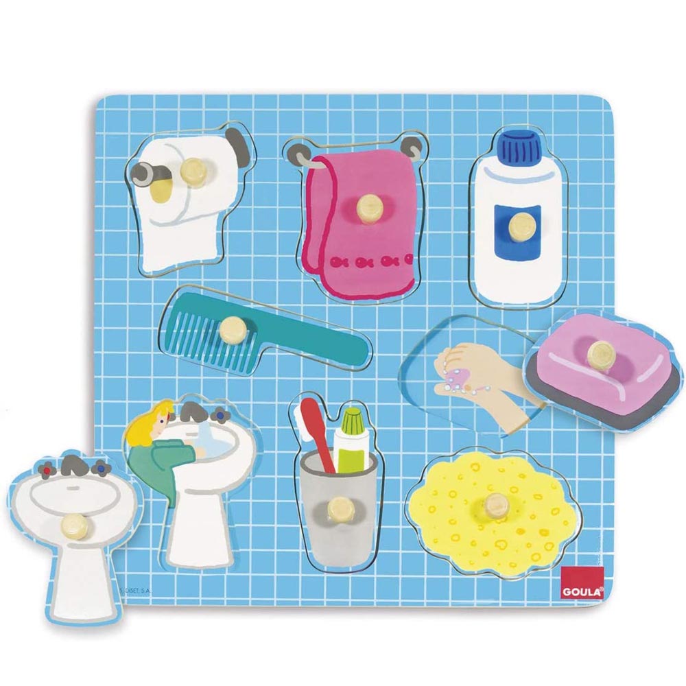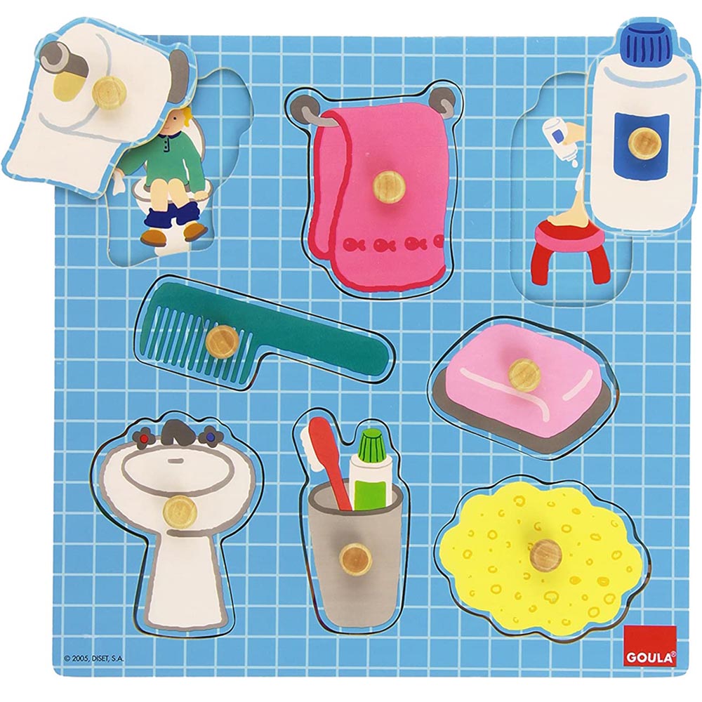 Puzle de tarugo en base de madera. Puzle de 8 piezas encajables. Asociación de elementos del baño y su acción correspondiente.