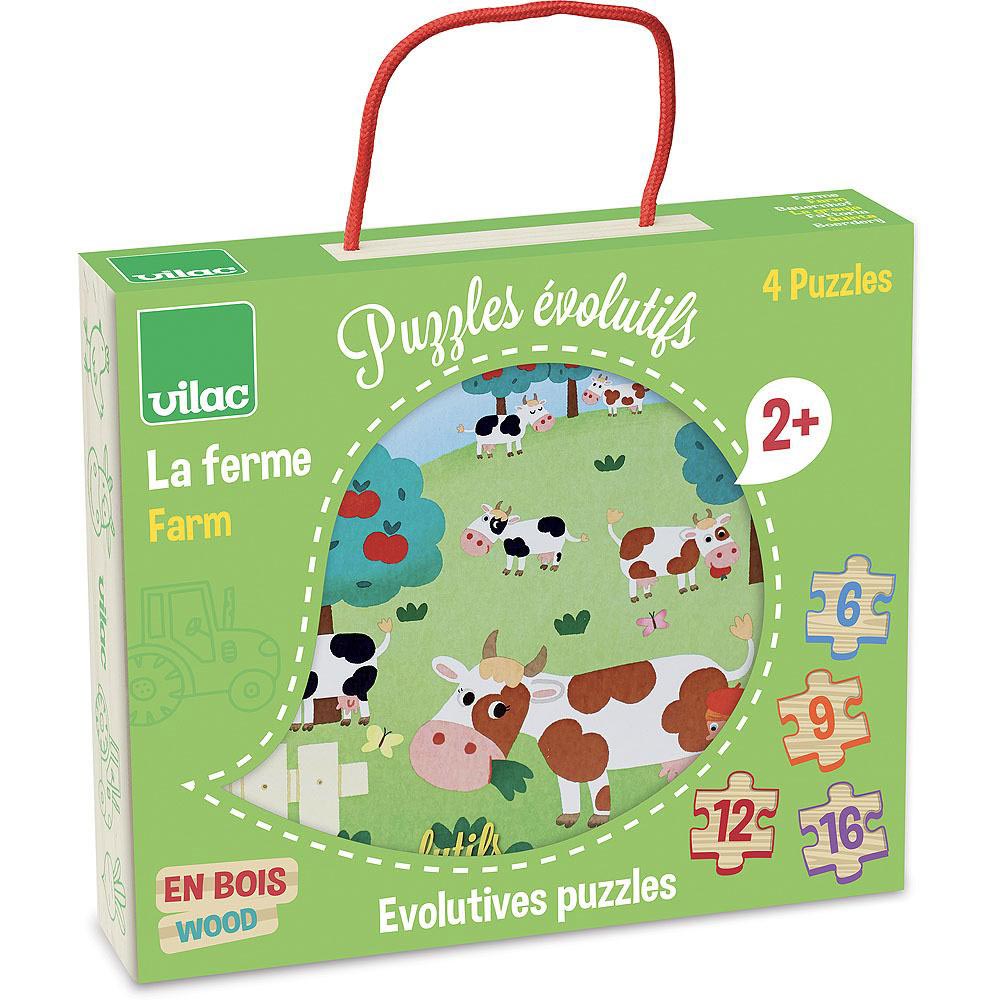 Hermosos puzles evolutivos con motivos de granja. Presentados en una preciosa caja de madera, incluye 4 puzles de dificultad creciente (6, 9, 12 y 16 piezas) con hermosas ilustraciones que lo hacen muy atractivo para los más pequeños. Recomendado a partir de 2 años, fabricado con material suave y resistente.