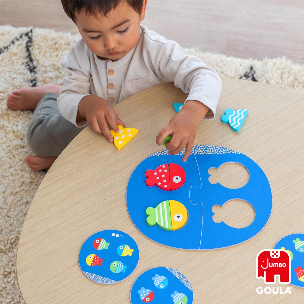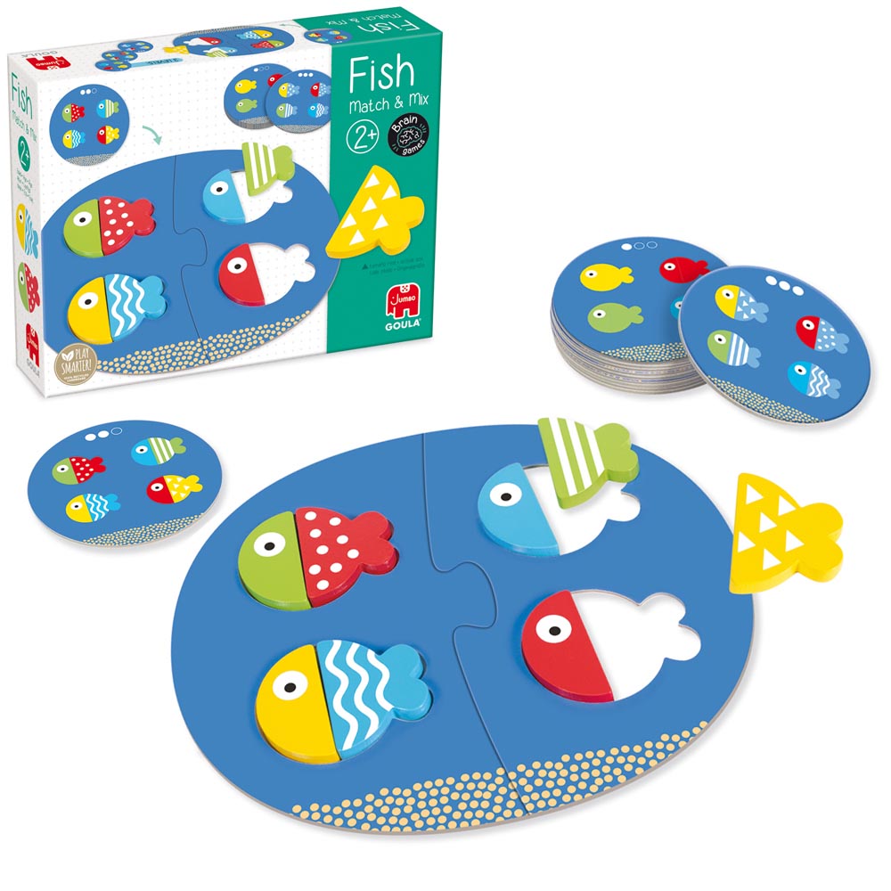 En este divertido juego preescolar los pequeños tienen que completar correctamente los 4 peces en el mar según indican las cartas. Con este juego aprenderán los colores y las diferentes tramas. Las cartas tienen tres niveles progresivos para ir avanzando de dificultad. Empezaremos jugando con las cartas más sencillas en el que las cabezas de los peces siempre van colocadas en el mismo sitio y se tendrán que colocar las colas de los peces de color liso (nivel 1), en el siguiente nivel las cabezas de los peces aparecen en cualquier orden y se incorporan las tramas en las colas de los peces (nivel 2) y, finalmente, en el nivel de mayor dificultad, desaparece el color de las colas y hay que adivinar qué cola le corresponde a cada pez en función de las tramas (nivel 3). Fish match & mix forma parte de la colección brain games, una gama de juegos para desarrollar el razonamiento lógico con retos de dificultad progresiva para que los niños y niñas aprendan a su ritmo. estimula el desarrollo del razonamiento lógico y la percepción visual. Edad recomendada: a partir de 2 años. Incluye: base de juego, 8 piezas de madera y 12 cartas con 24 desafíos progresivos.
