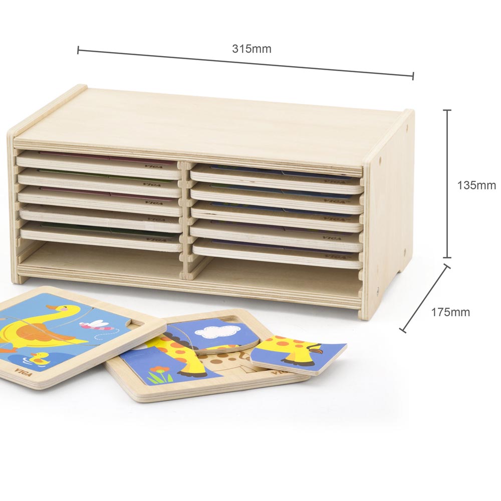 Set de 12 puzles de 4 piezas de madera en caja organizadora, con ilustraciones de animales muy divertidos. De material suave y resistente y colores vivos. Los puzles son juegos que estimulan a los niñas y niños en el desarrollo de la coordinación mano-ojo, el reconocimiento de colores y formas, el pensamiento lógico, la concentración y mucho más.
