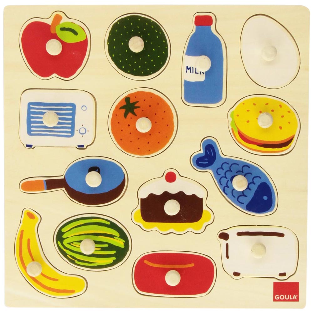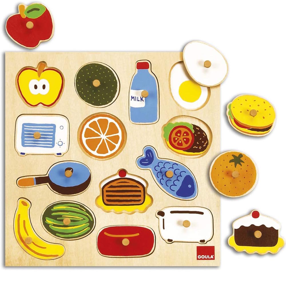 Puzle de madera con 14 tarugos. Los dibujos corresponden a cosas de una cocina. Al levantar la pieza vemos lo que existe dentro del dibujo. Un hermoso Puzle para aprender y divertirse.