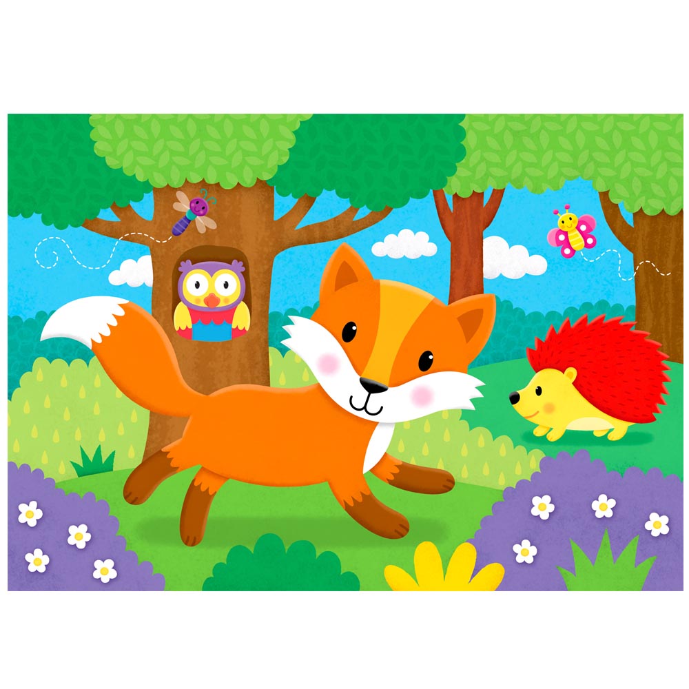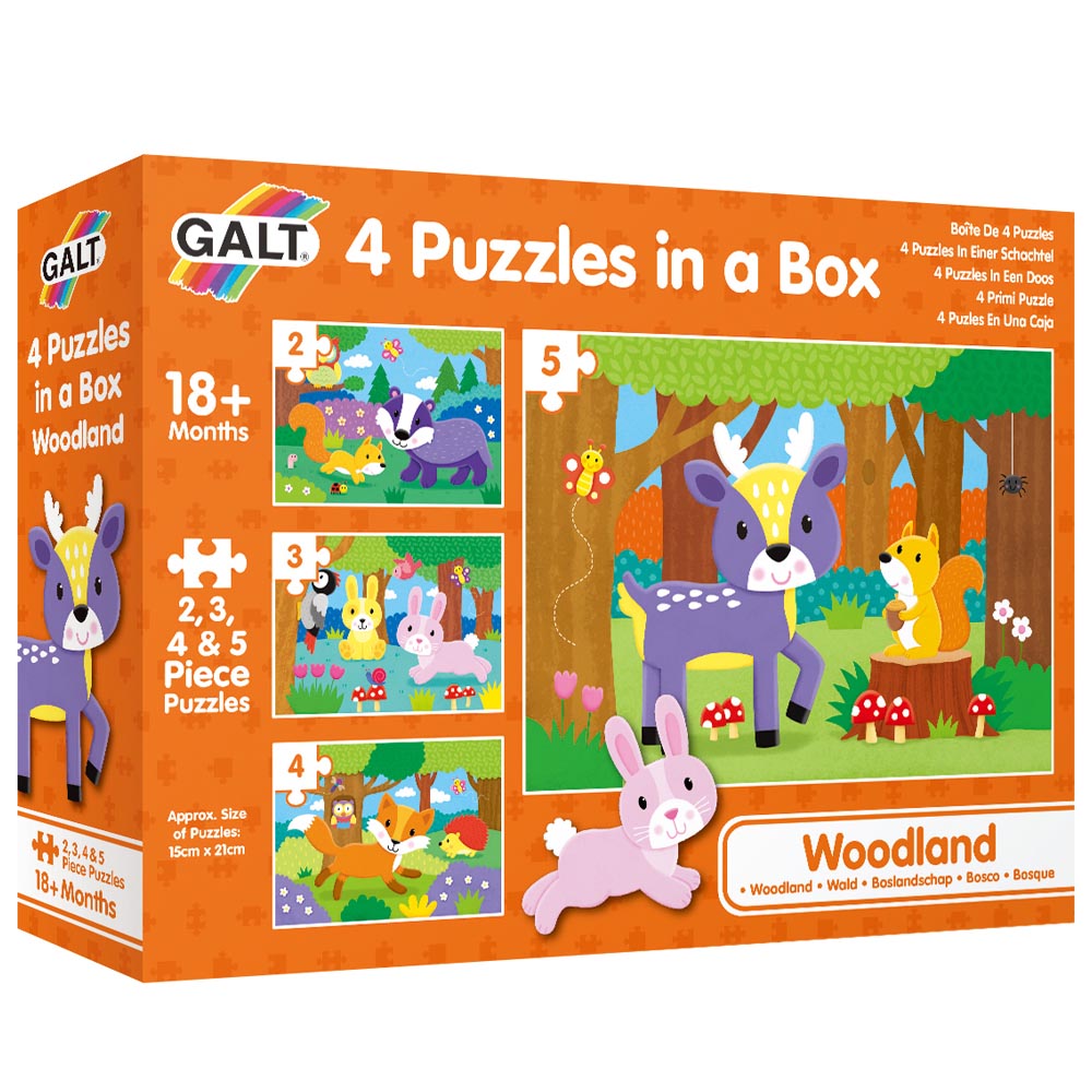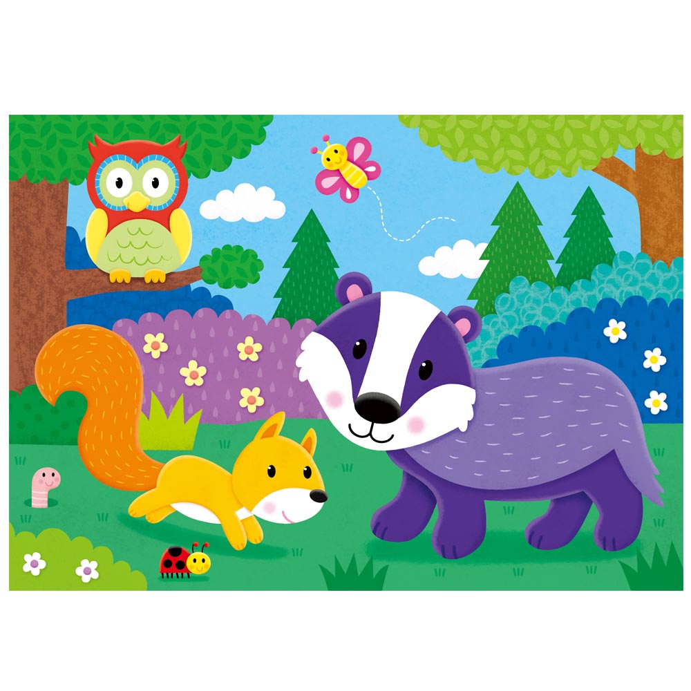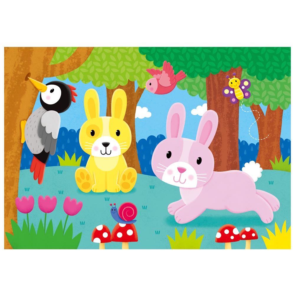 4 rompecabezas con divertidas escenas de bosque para niños muy pequeños. Estos primeros y coloridos Puzles, cada uno con número distinto de piezas, alentarán el desarrollo de habilidades de emparejamiento y clasificación.