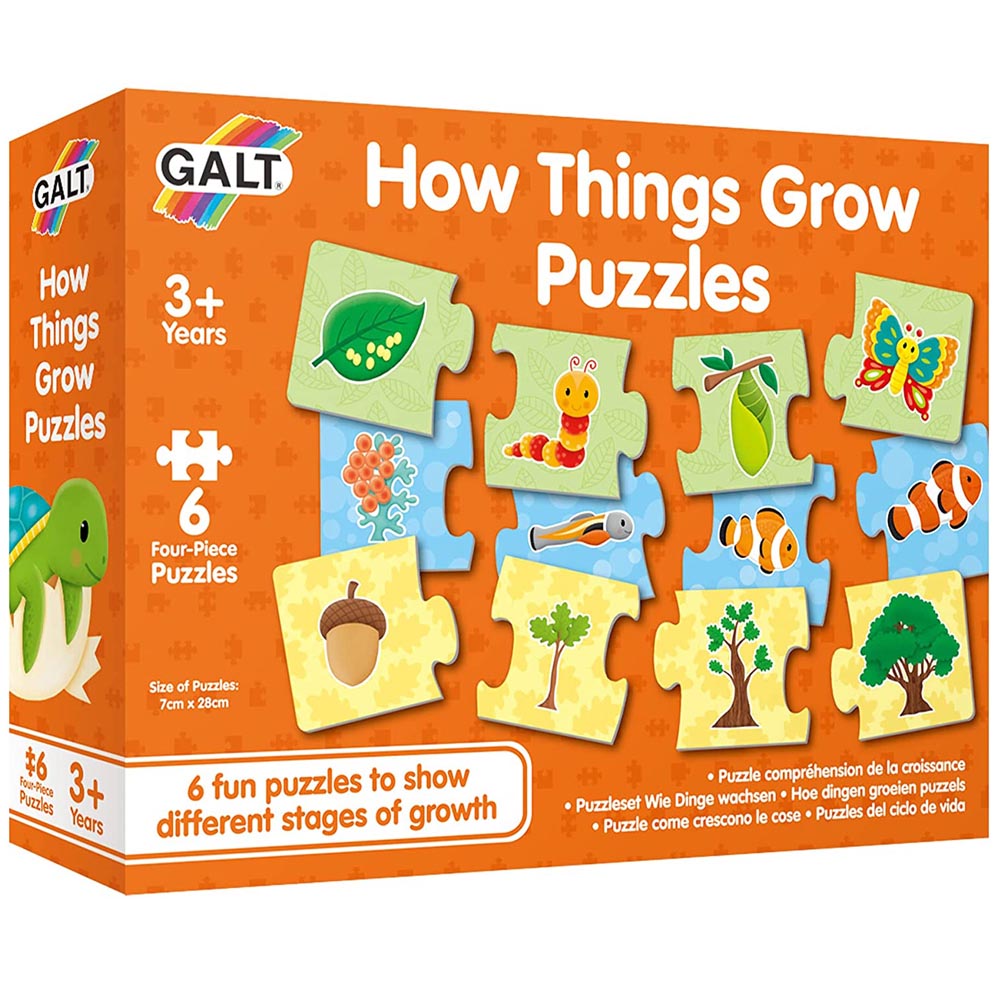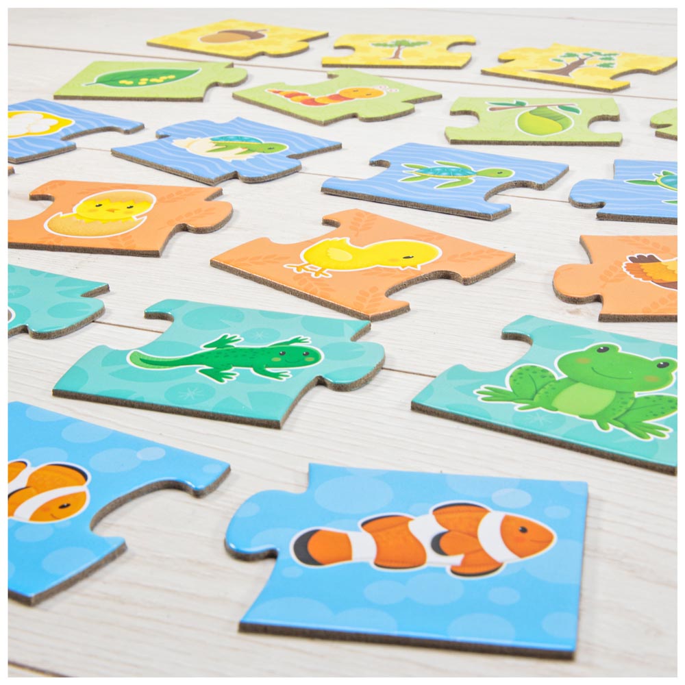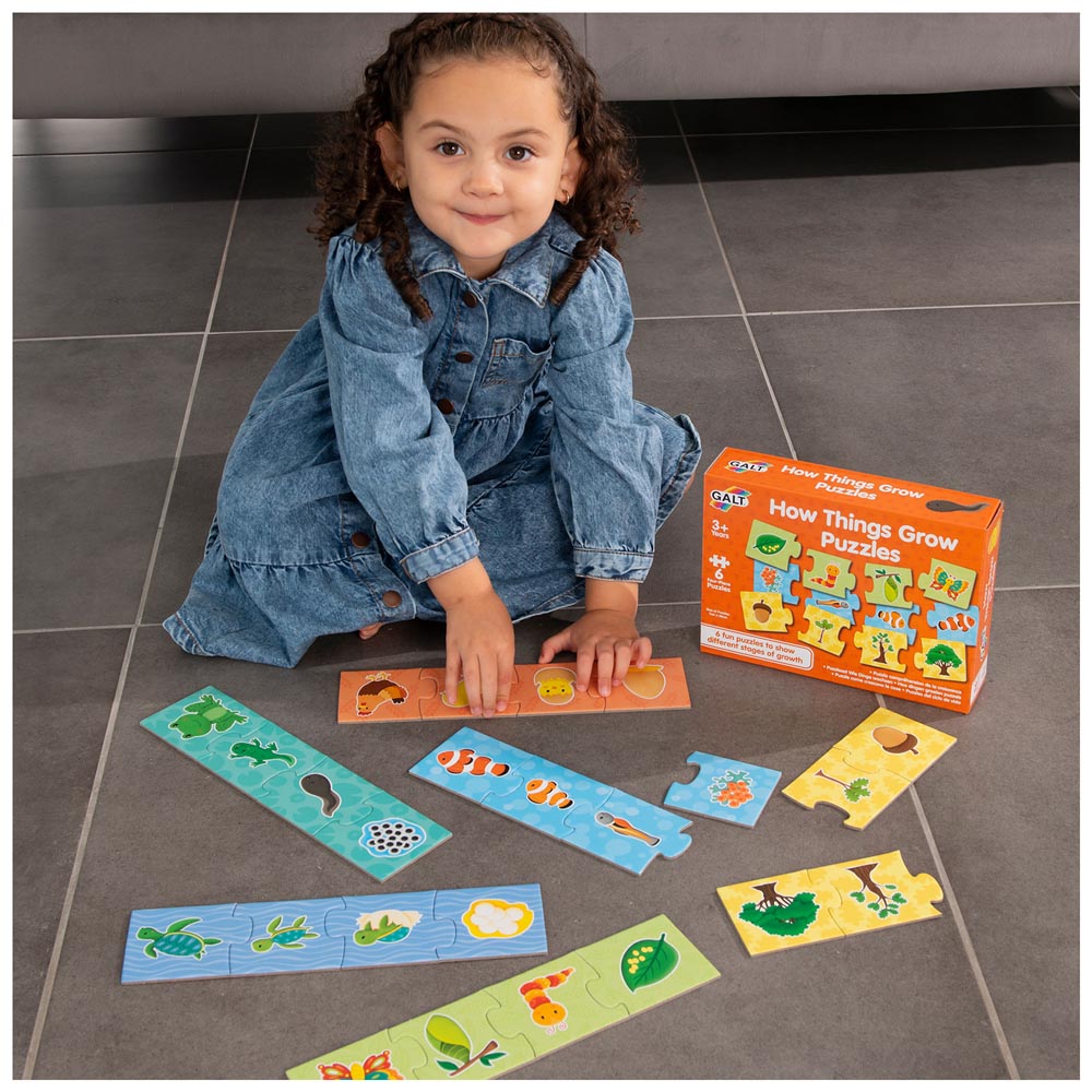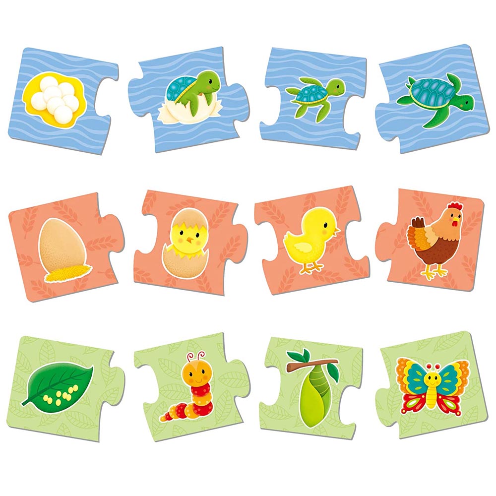 Divertido rompecabezas: estos 6 coloridos rompecabezas de 4 piezas cuentan con los emocionantes y variados ciclos de vida de las cosas vivas conocidas. Aprende a través del juego: a tu pequeño le encantará descubrir cómo crecen sus animales y plantas favoritas. Fomenta el desarrollo de la concentración, la coordinación ojo-mano y el reconocimiento de formas, ya que solo las piezas correctas encajan juntas. Duradero y fácil de limpiar, las piezas son fáciles de manejar, están hechas de cartón grueso. Tamaño del Puzle: 7 x 28 cm, de 4 piezas cada uno. Perfecto para manos pequeñas: apto para niños de 3 a 6 años.