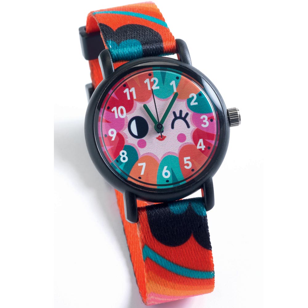 Hermoso reloj Djeco elegante y colorido para saber la hora y divertirse. El reloj cuenta con una pantalla educativa que muestra tanto los números de las horas como los minutos. Movimiento japonés silencioso. A prueba de salpicaduras. La correa de poliéster mide 20 cm x 14mm y el reloj 3 cm diámetro. Contra agua. Batería Sony incluida. De maravilloso diseño Djeco.