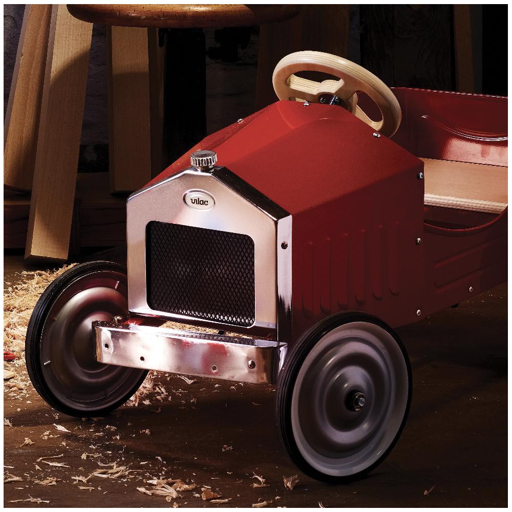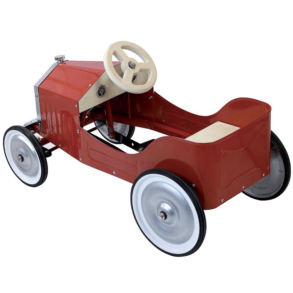 ¡Hermoso coche de carreras elegante y atemporal para emprender una aventura! Coche de pedales de metal grande con acabado lacado rojo y elementos de madera natural. Recomendado a partir de 3 años. Altura del asiento: 23 cm.