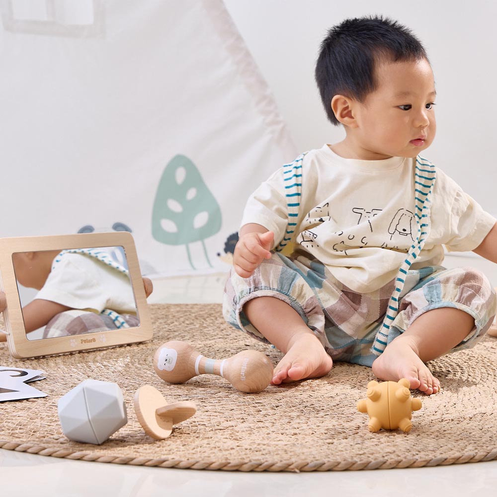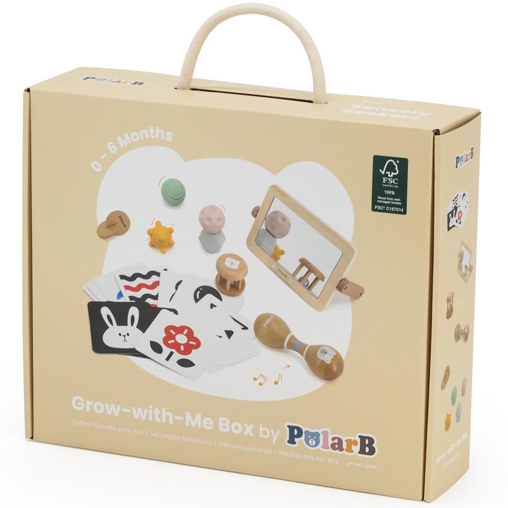 Hermoso set de juguetes sensoriales diseñado para estimular el desarrollo de los más pequeños a través del juego creativo. Este set contiene una combinación de juegos diseñados para acompañar el desarrollo de los bebés en las primeras etapas de su crecimiento. Todos los juegos ayudan a que los más pequeños descubran su entorno con sus ojos, sus oídos y sus manos. Cada juguete provocará la exploración cuidadosa estimulando el desarrollo de las habilidades motoras y cognitivas. Fabricado en madera de alta calidad con superficies lisas y esquinas redondeadas que dan mayor seguridad. Incluye set de tarjetas de alto contraste, 1 espejo, 1 maraca dobles, 1 sonajero, 2 círculos interconectados, 4 pelotas sensoriales y un manual educativo.