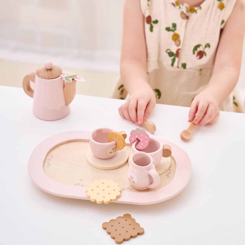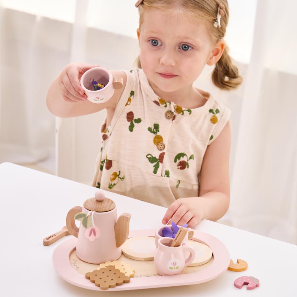 Hermoso set de te para pasar horas de diversión. Un juego que anima a los niños a participar en juegos de rol creativos, lo que ayuda a desarrollar su imaginación y la capacidad de simular situaciones cotidianas. Promueve las habilidades sociales a través de la oportunidad de jugar con otros, el conjunto enseña a los niños pequeños a cooperar, compartir y comportarse educadamente durante las interacciones sociales. Fabricado con madera segura, sin bordes afilados, lo que lo hace adecuado para los más pequeños. Incluye: 1 tetera con tapa, 2 tazas con platillos, 2 cucharaditas y 2 bolsitas de té, 1 jarra de leche, 1 rodaja de limón y rodaja de fresa, 2 galletas, 1 bandeja para servir.