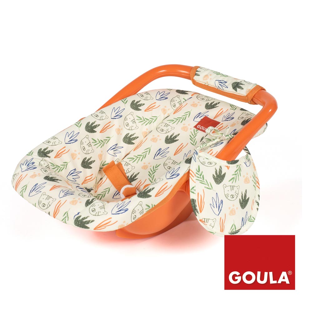 Viaja con tus muñecas en el auto con el portabebés. Con un precioso estampado de jungla. Asa reclinable, incluye babero. Ideal para muñecas de 30 a 42 cm.