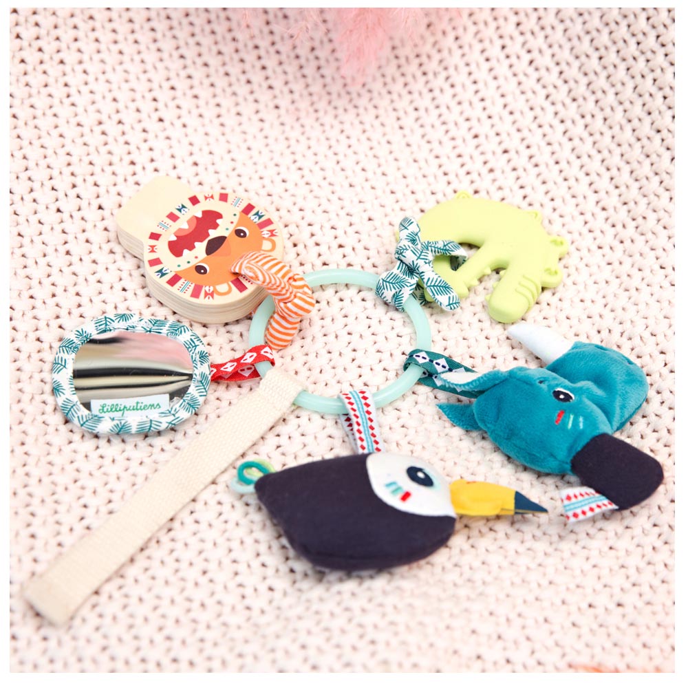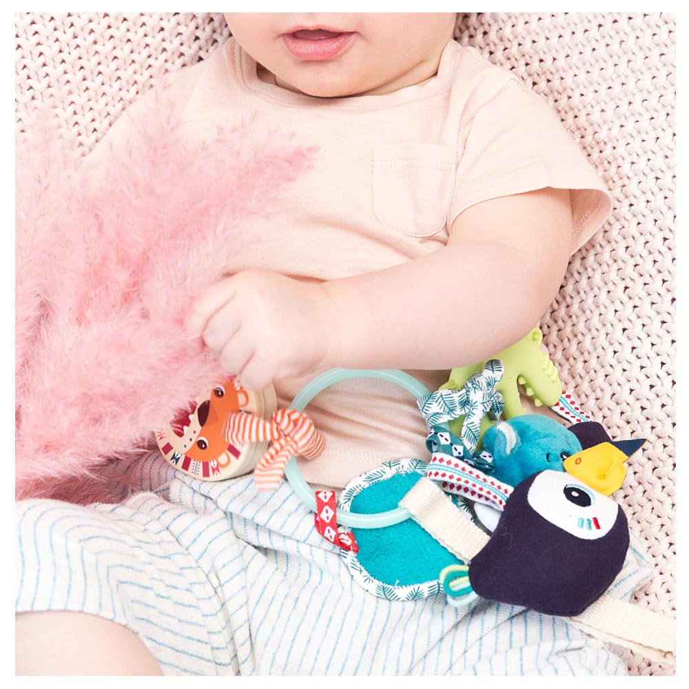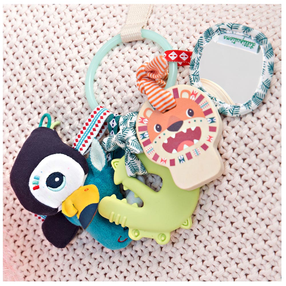 Una diversa gama de materiales, colores y sonidos hace de este llavero una auténtica experiencia de descubrimientos para los más pequeños. Pablo, Marius, Anatole y Jack se han unido formando un círculo. Juega con tus personajes favoritos y descubre miles de sensaciones con este llavero de estimulación sensorial. Tenemos a Anatole y a Jack mordedores y a Marius y a Pablo como mini-sonajeros. Además de un espejo donde te podrás ver reflejado. De material suave y resistente.