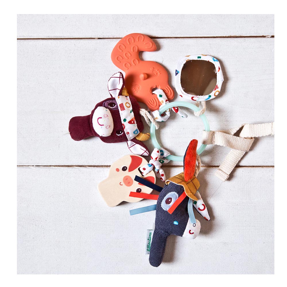 Una diversa gama de materiales, colores y sonidos hace de este llavero una auténtica experiencia de descubrimientos para los más pequeños.