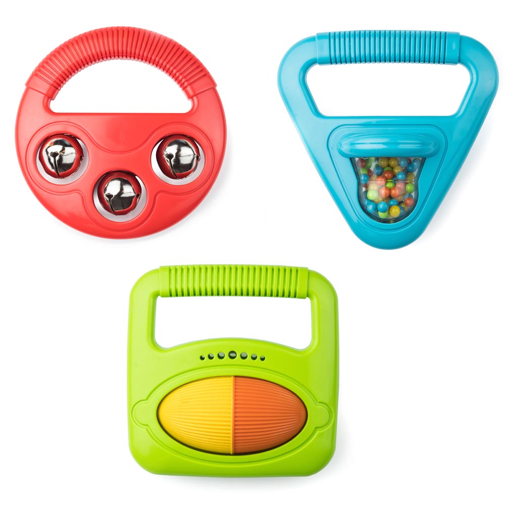3 sonajeros surtidos para los mas pequeños, para empezar desde pequeños en el increíble mundo de la música. Brillante y colorido shaker, campanas y rattle roller, cada uno produce sonidos distintos y son fácil de utilizar para manos pequeñas. Colores y modelos surtidos. Precio por unidad.
