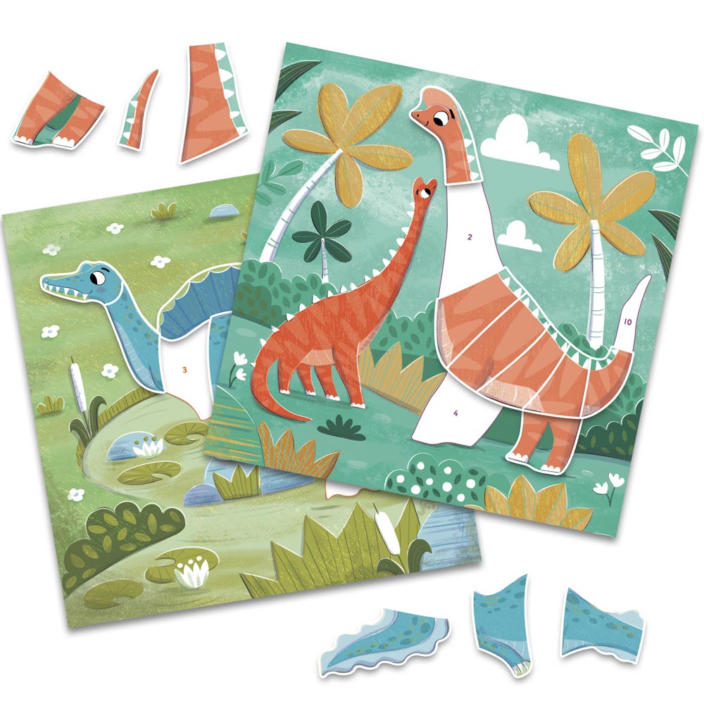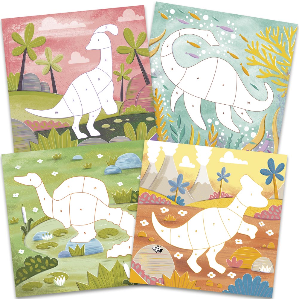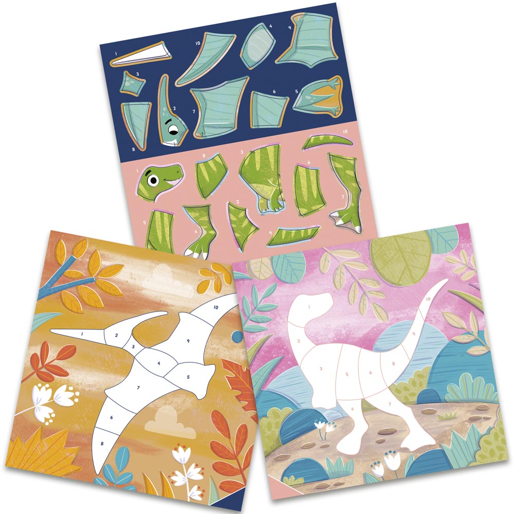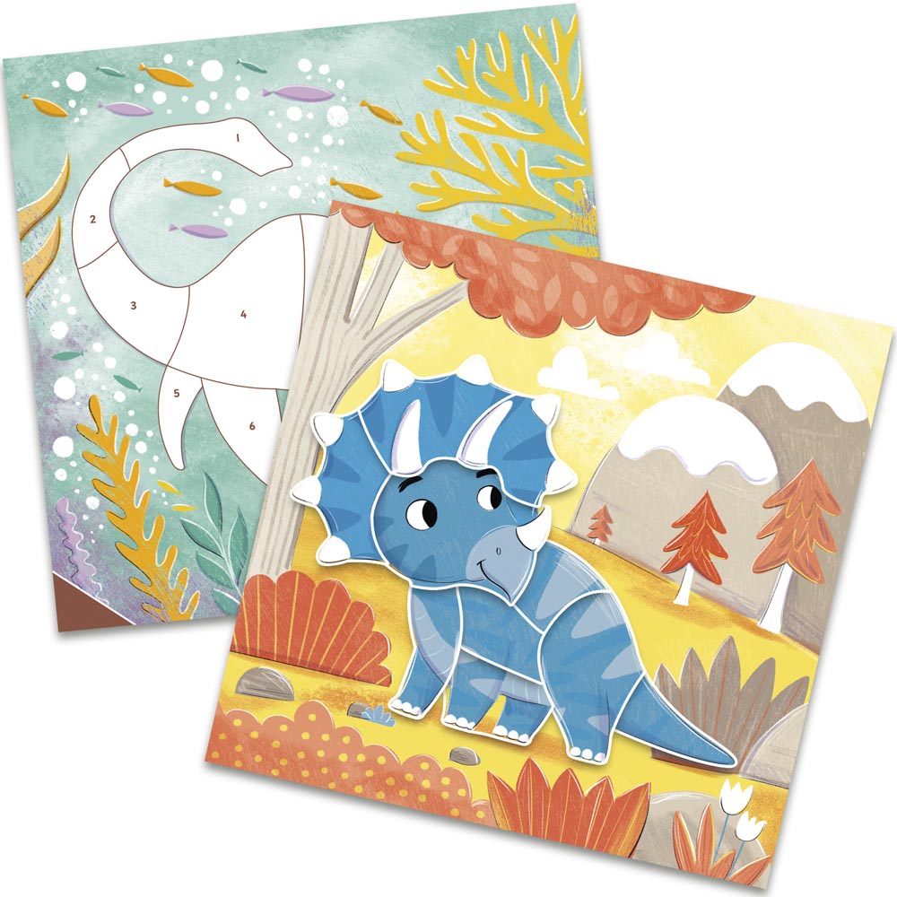 Con este divertido cuaderno de stickers los niños y niñas pueden crear 12 escenas de dinosaurios con 120 pegatinas de colores. Los más pequeños deben hacer coincidir las pegatinas numeradas con los espacios de la página. Fomenta el reconocimiento de números y colores.