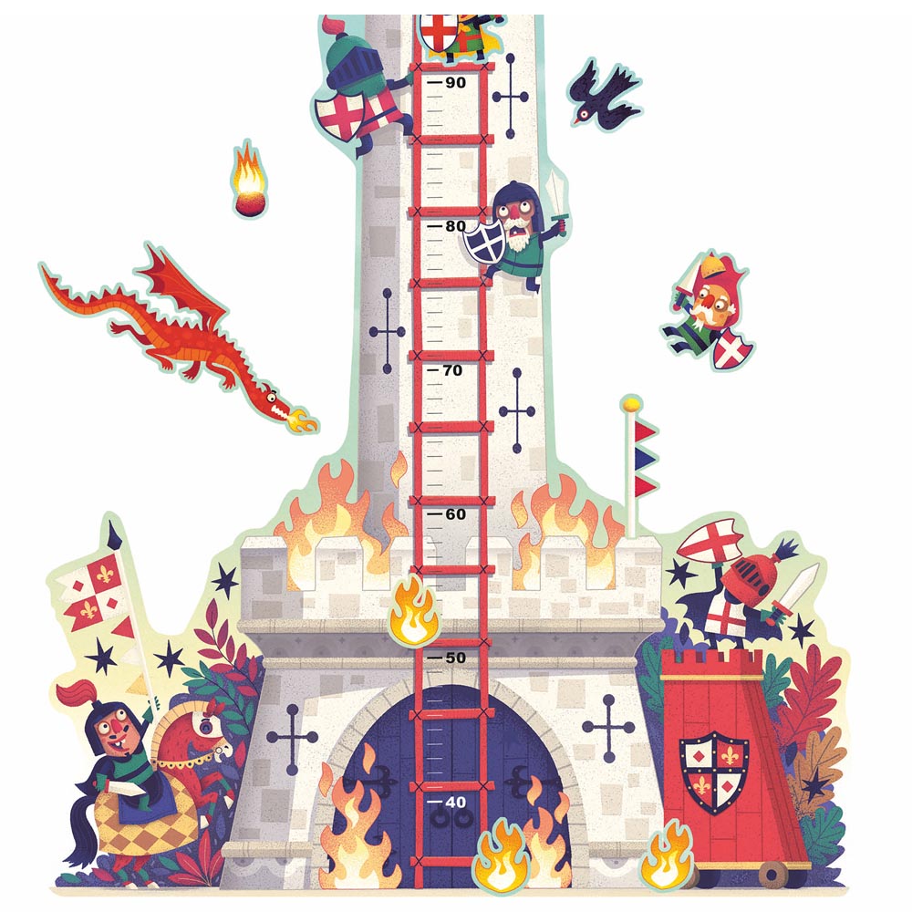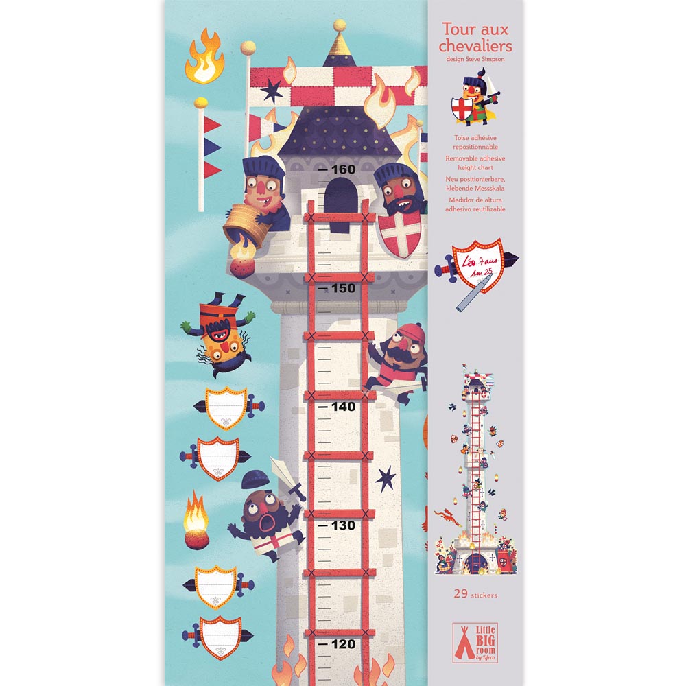 Hermosa y divertida tabla de altura de la torre del caballero de Djeco. ¿Qué tan alto eres hoy? esta divertida y adorable tabla de alturas es un accesorio hermoso y práctico para la habitación de los mas pequeños y pequeñas. El paquete incluye 29 pegatinas individuales y el gráfico mide hasta 160 cm.