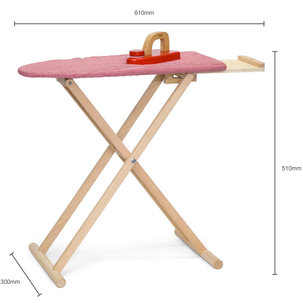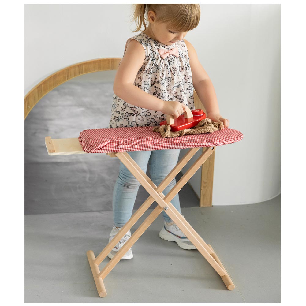 Tabla de planchar hecho con madera de alta calidad. Incluye plancha de madera. Los niños pueden fingir planchar en esta resistente tabla de planchar.