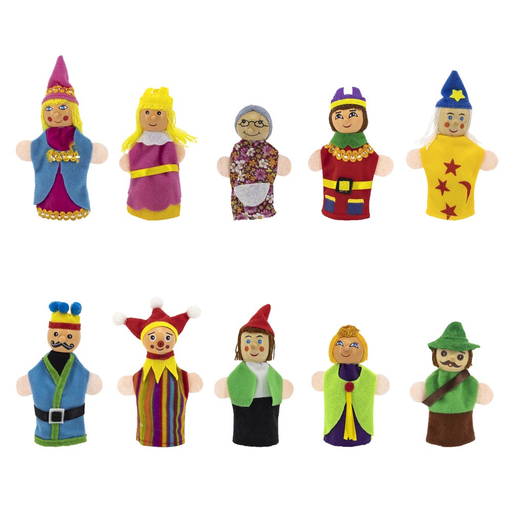 Precioso teatro de títeres de dedo de madera pintado a mano. De tamaño adecuado para las manos de los niños. Incluye 10 títeres de dedo de genero con cabeza de madera pintados a mano y con pelo de lana (caperucita, duende, lobo, enano, chanchito, niña, conejo, hada, gato y mago cada uno de 15 cm aprox.)