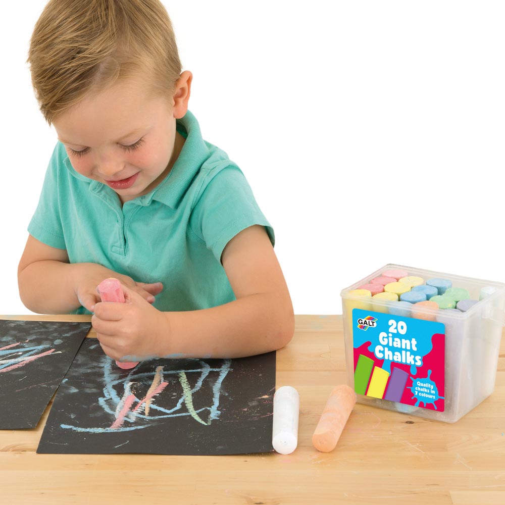 Tizas extra grandes de excelente calidad, vienen en una práctica caja plástica con asa para llevarla cómodamente a todas partes. 7 colores diferentes.