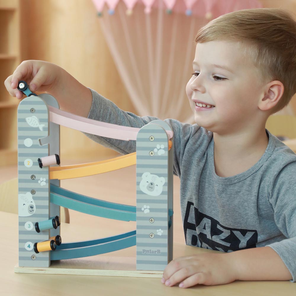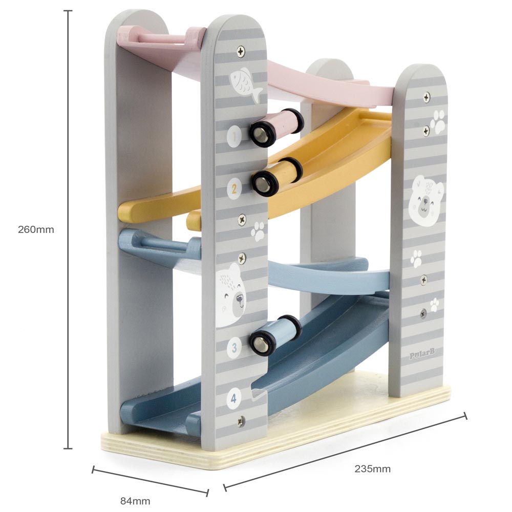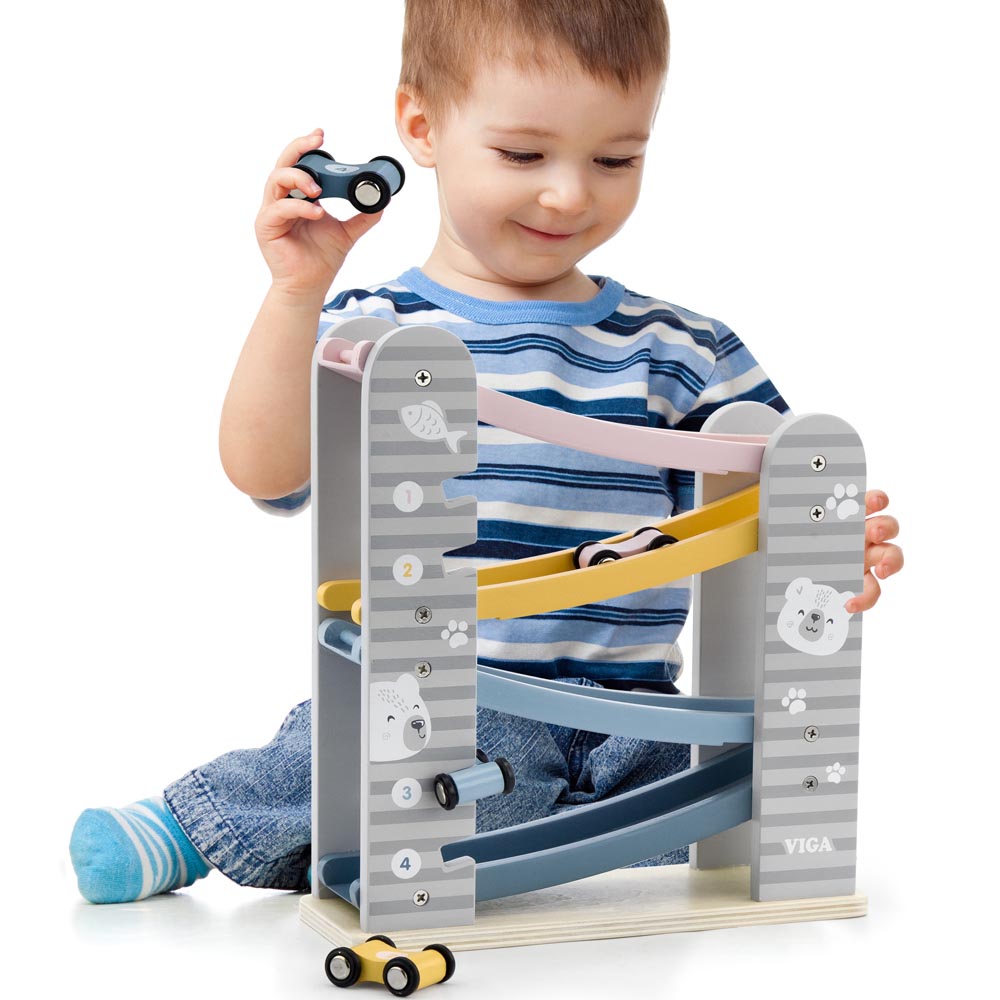 Divertida torre de deslizamiento en colores pasteles con 4 vehículos para pasar horas de diversión. Diseñada para estimular las habilidades motrices de los más pequeños, aprendiendo a su vez números y colores. Un juego de acción y reacción ideal para edades tempranas. Fabricado en madera. De material suave y resistente. Recomendado a partir de los 18 meses de edad.
