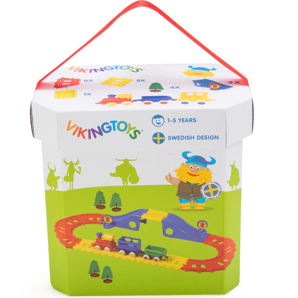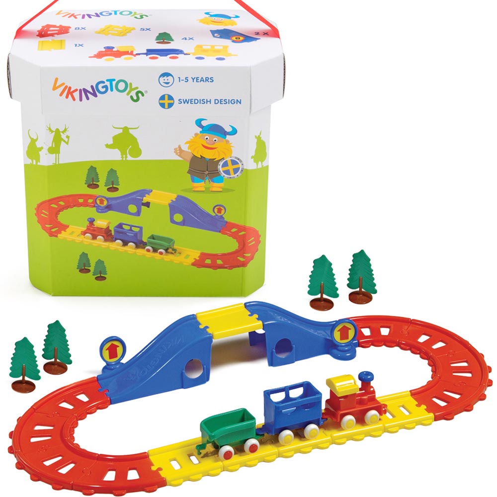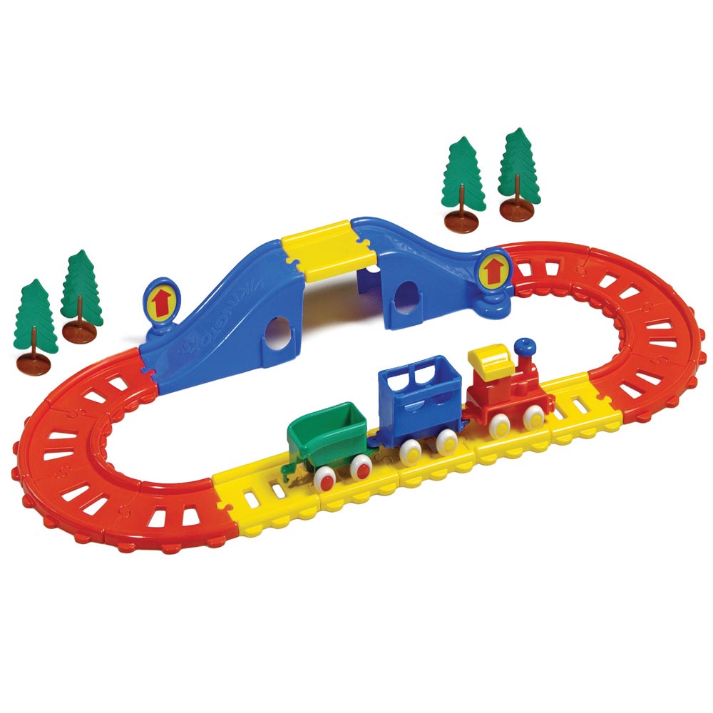 Tonel con 23 piezas de plástico resistente y brillante. 14 rieles en dos colores ( 8,5 x 8 x 1 cm), 1 puente, tren de 3 carros (27 cm) y 4 arboles. Las ruedas de goma giran con facilidad, tienen ejes firmes y no se salen. De material totalmente reciclable. Fabricado en plástico blando flexible sin bordes afilados, sin nada que pueda romperse o partes que puedan caerse. Un juguete de alta calidad con los ejes hechos de acero resistente a la oxidación, por lo que pueden soportar el juego duro y las condiciones de humedad. Recomendado para jugar tanto en interiores como en exteriores. Libre de tóxicos y fácil de lavar. De excelente diseño y brillantes, y vivos colores. Armado 67 x 33 cm.