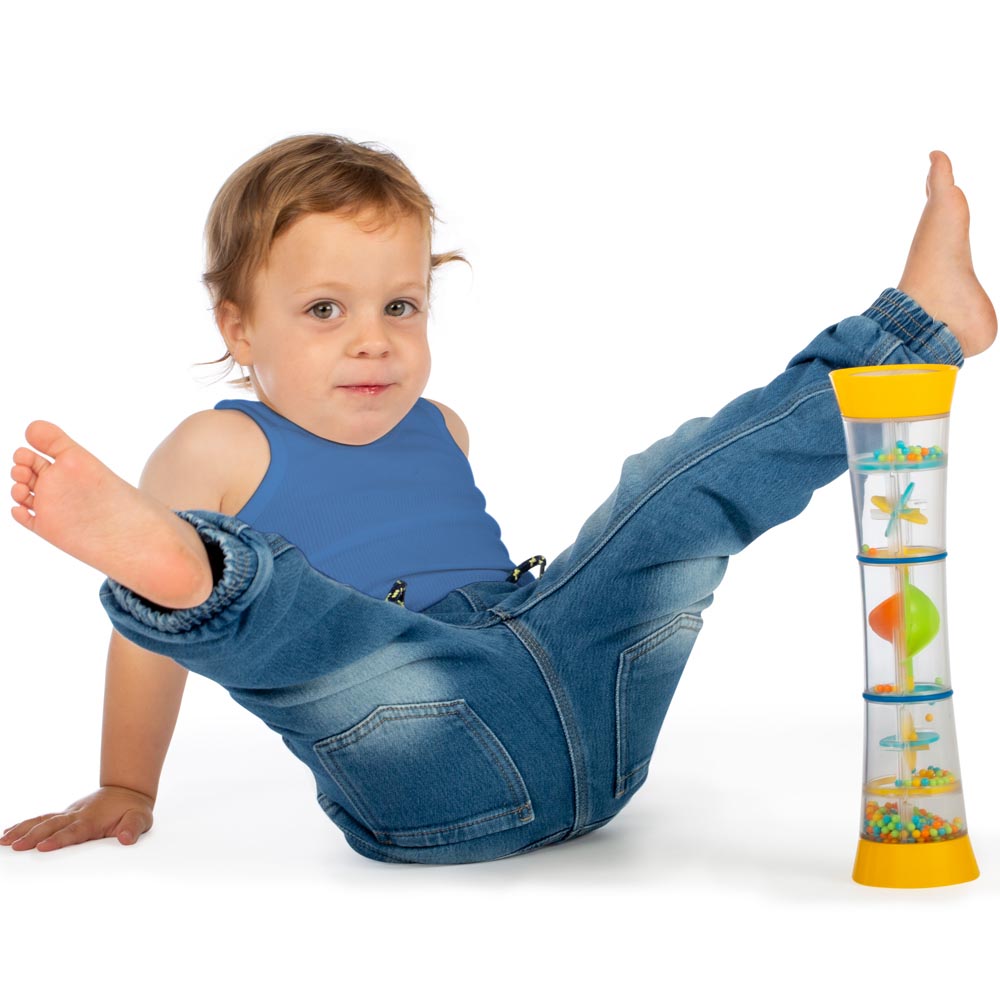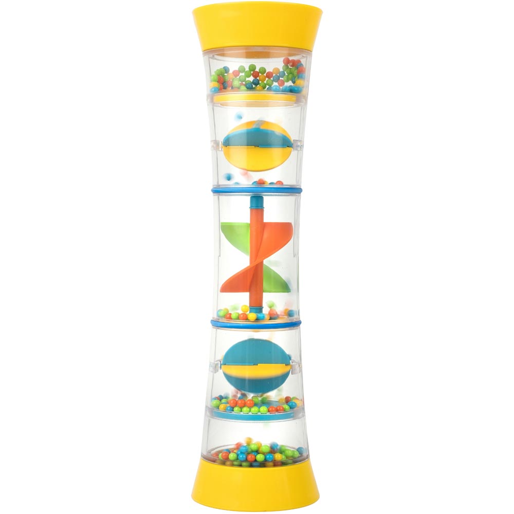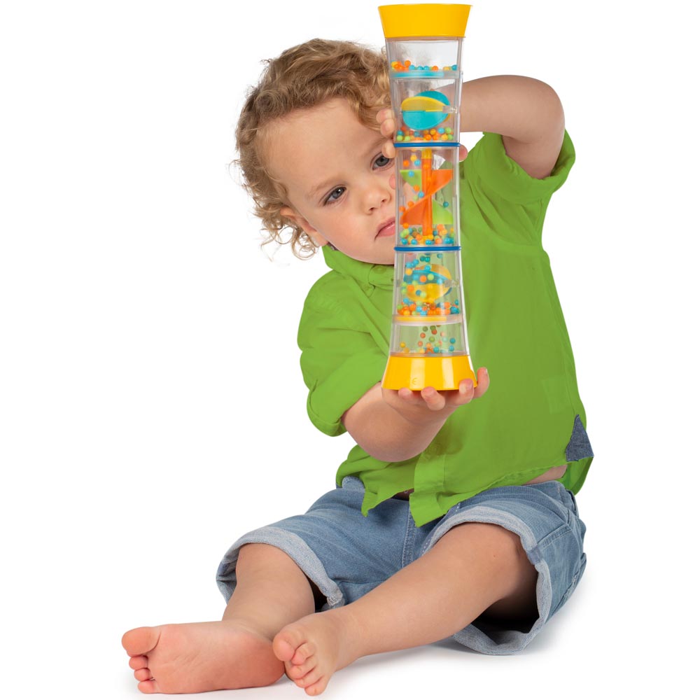Este tubo de sonido es un encantador instrumento musical real que crea una cautivadora combinación de sonido y color. Al girarlo el bebé podrá observar cómo las cuentas de colores caen en cascada a través del tubo, creando sonidos fascinantes y efectos visuales que deleitarán a los niños pequeños. El Twirly Whirly Rainbomaker mide 30 cm de largo, es resistente, duradero y cómodo de sostener para las manos pequeñas. Fabricado en material suave y resistente.