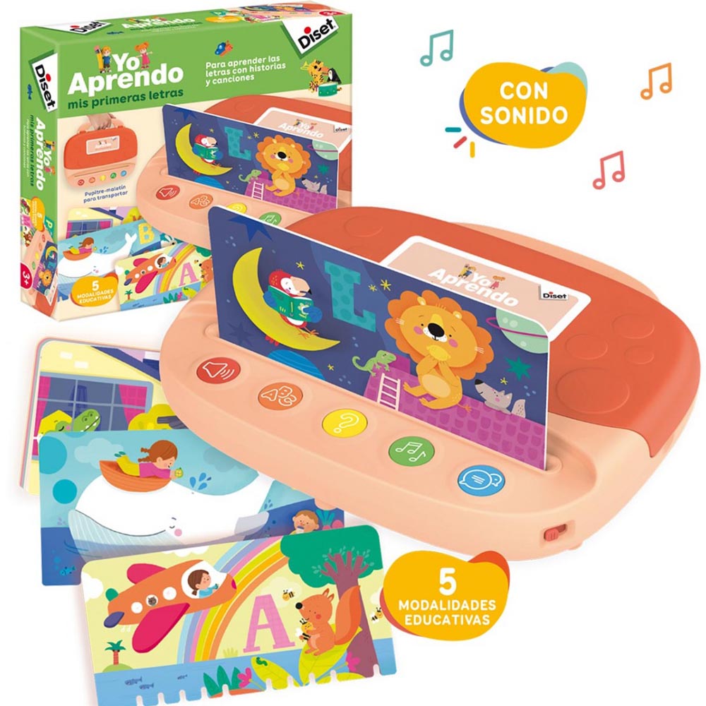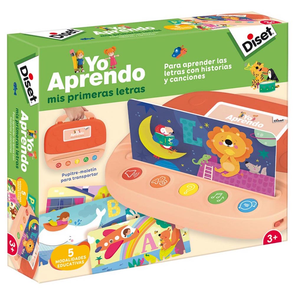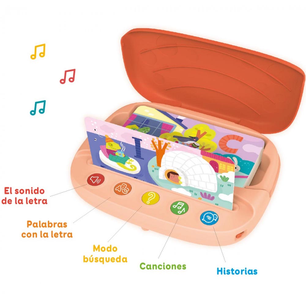 Divertido maletín educativo con el que los niños y niñas aprenderán su primer abecedario, ampliarán su vocabulario y su fonética escuchando el sonido de las letras, palabras que empiezan por cada una de ellas, canciones, historias y mucho más. Con cada tarjeta se proponen 5 actividades. Un juego ideal para el desarrollo del lenguaje de una forma muy entretenida. Recomendado a partir de los 2 años. El tablero mide 24,4 x 22,1 x 4 cm.