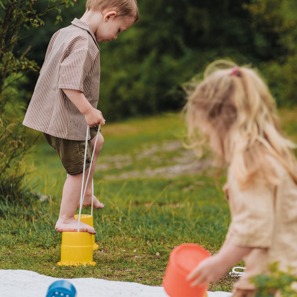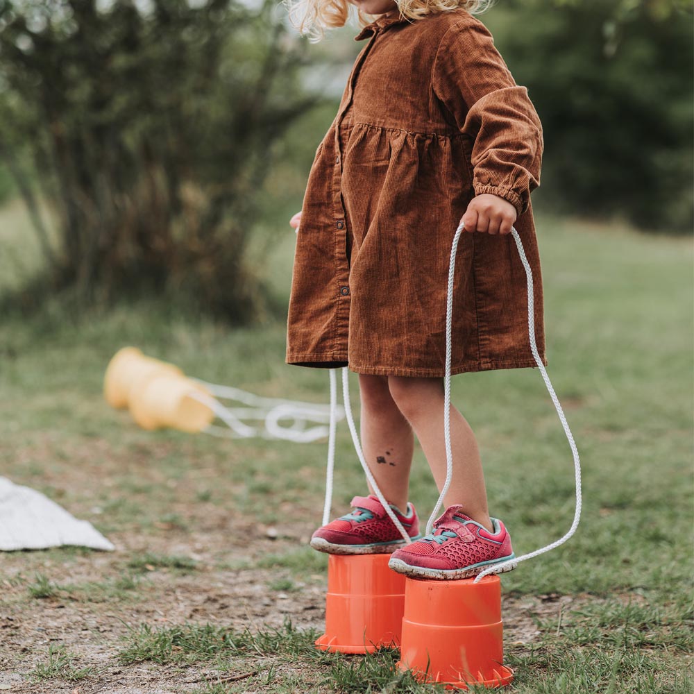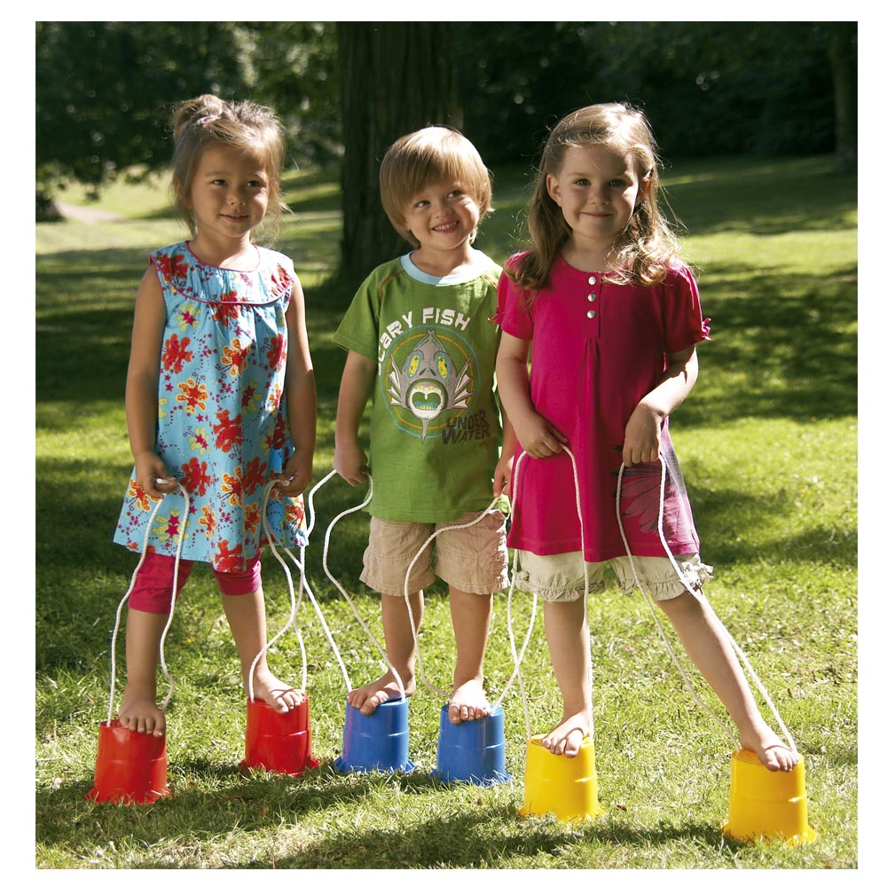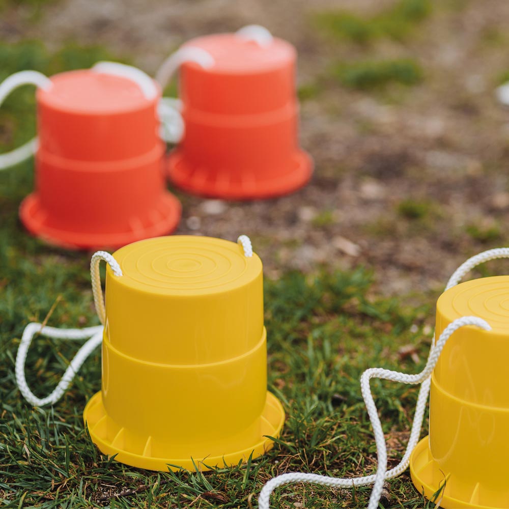 Set de 2 zancos de plástico resistente con cordeles para levantarlos. Especialmente diseñados para los programas de gimnasia de los mas pequeños.
