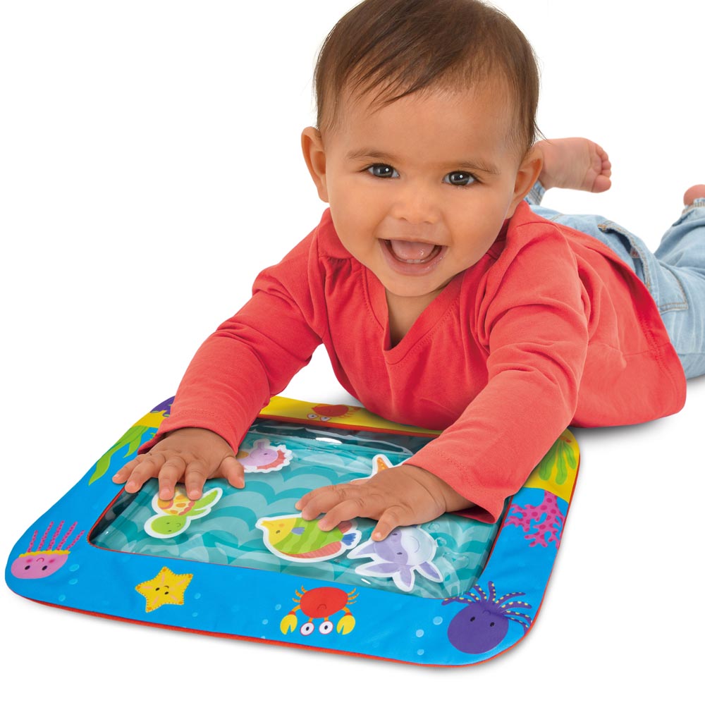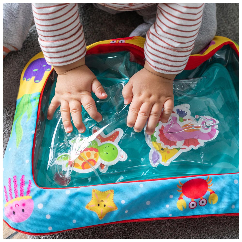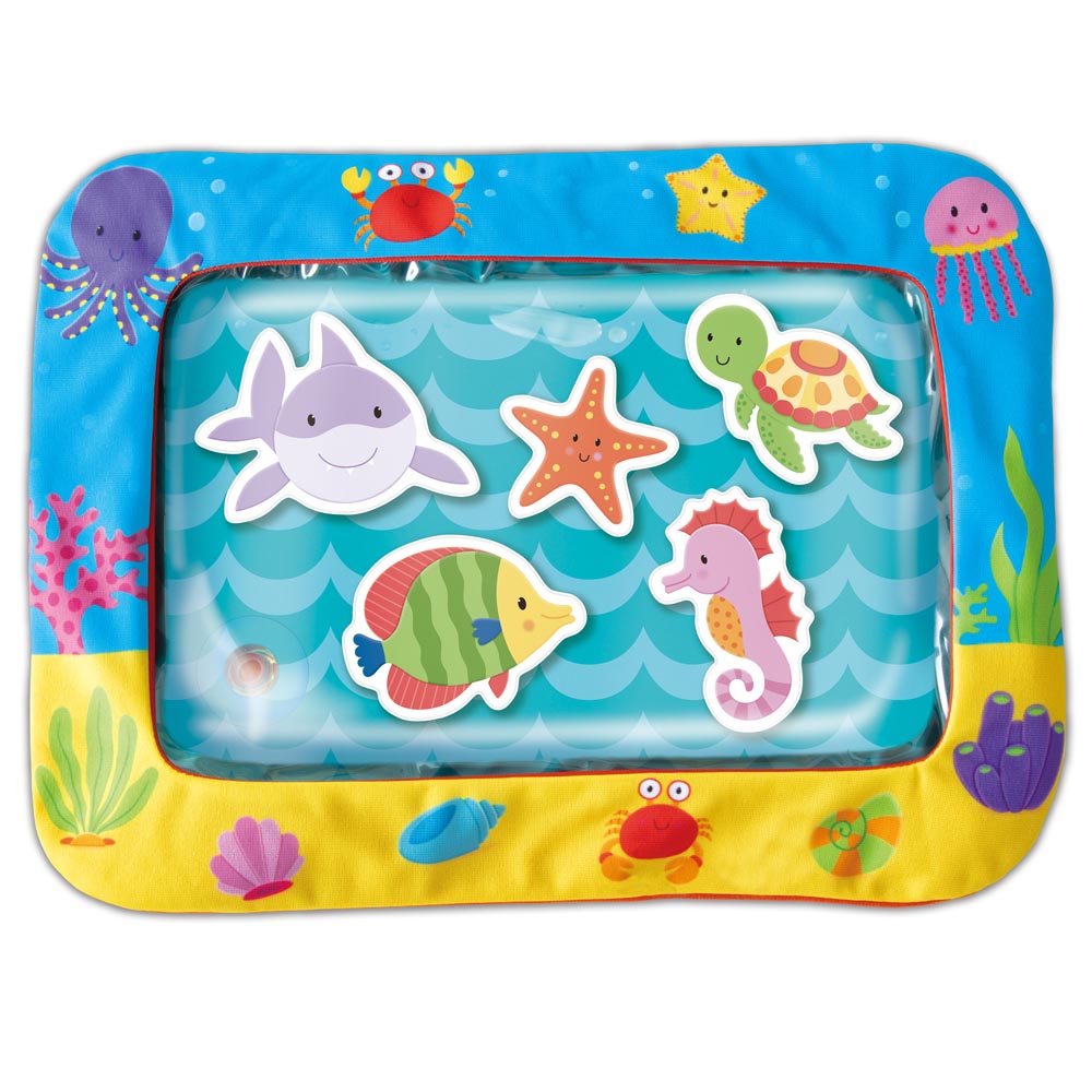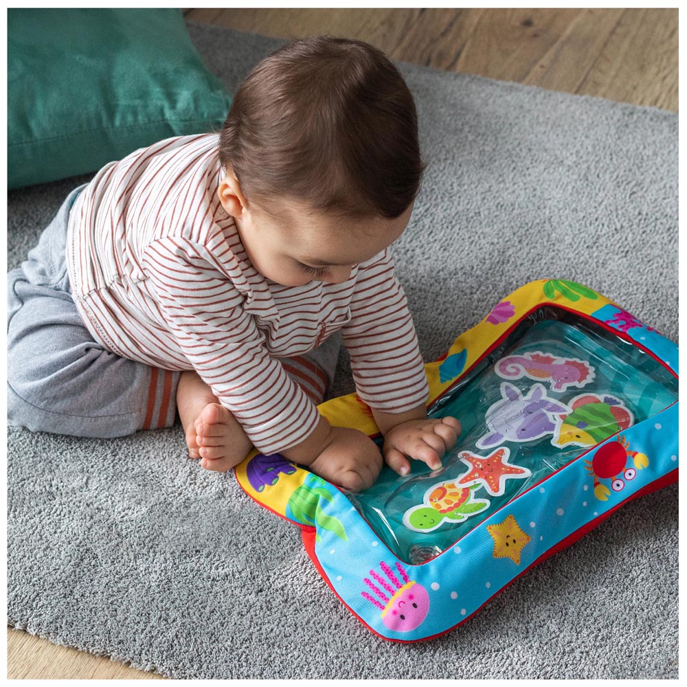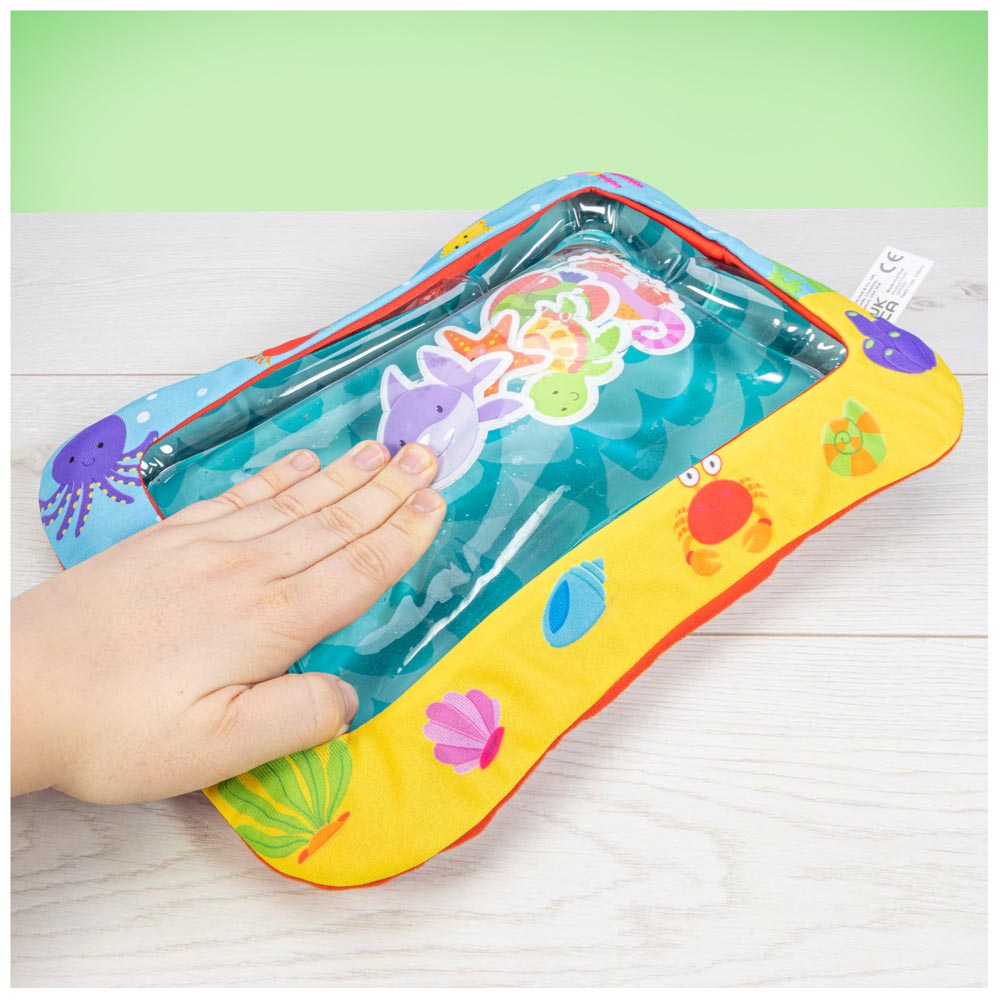 Hermosa alfombra de agua para llevar a todas partes para tu bebé, con colores vivos que estimularan el desarrollo y reconocimiento visual así como también el habla. Fomenta el aprendizaje temprano con hermosas ilustraciones. Los pequeños animales nadan cuando se aplica presión a la superficie de la alfombra enseñando a los bebés acerca de la causa y efecto. La funda suave proporciona mayor comodidad mientras el bebé explora el movimiento del agua. Lavable a máquina. Recomendado para bebés a partir de 3 meses.