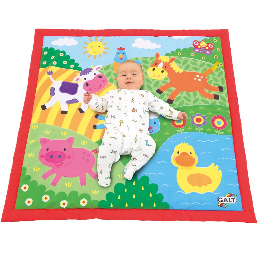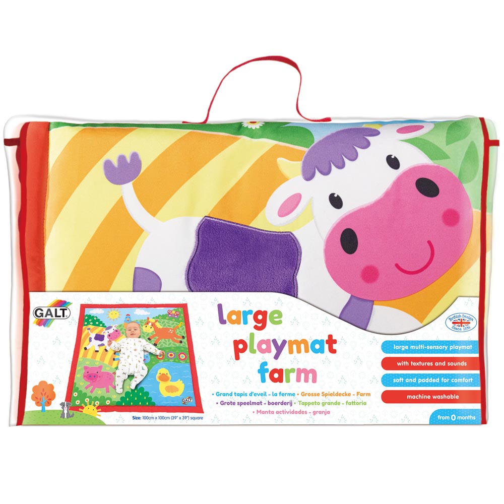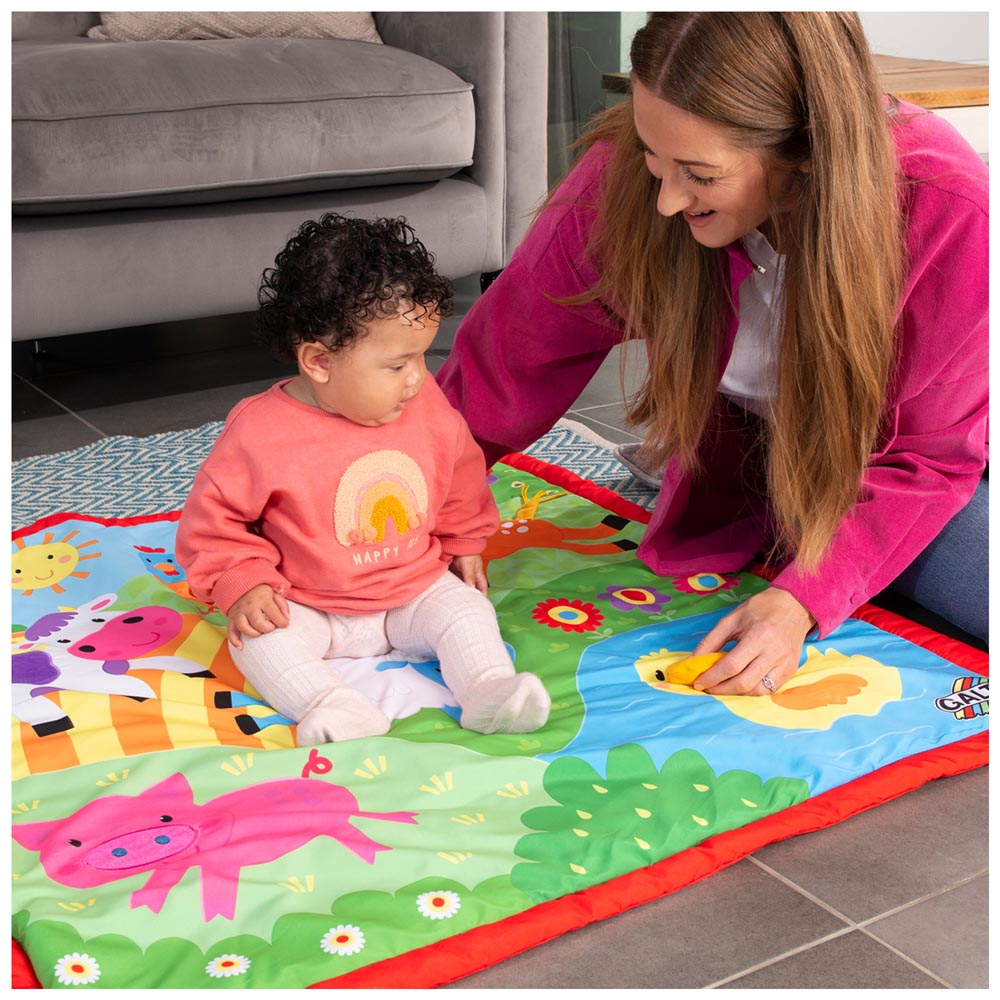 Una gran alfombra de juego multi-sensorial con 6 coloridos amigos de la granja. Suave y acolchado para la comodidad del bebe, el lugar perfecto para un bebe. Cuando el bebe se desarrolla, hay texturas y sonidos para explorar. Características, pico reluciente, parche de terciopelo, la nariz brillante, arruga ala, cabeza lanuda y cola lanuda. Lavable a maquina. 100 x 100 x 2 cm.