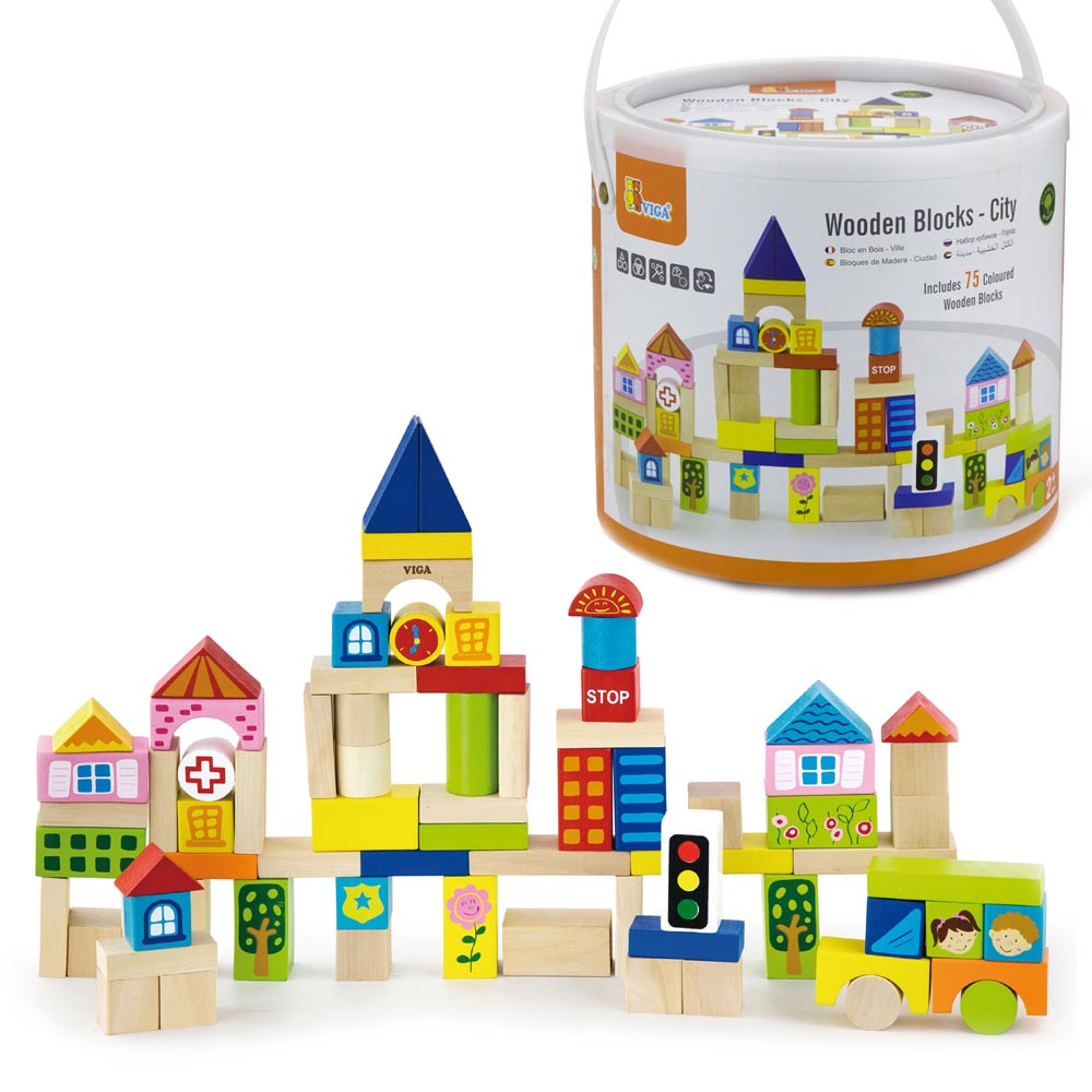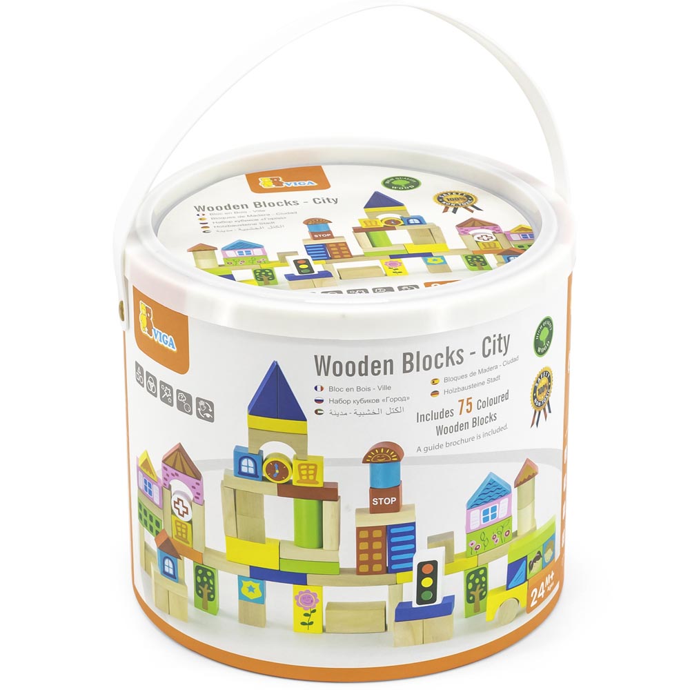 75 pz de bloques clásicos de madera de alta calidad, bloques en madera natural y otros pintados con colores brillantes e impresos a mano con diversos iconos de la ciudad (ventanas, arboles, semáforo, techo, reloj, flores, niños, señaléticas, etc.), para que los niños usen su imaginación para armar diferentes escenas. Contiene folleto con ejemplos a seguir. Bloque rectangular grande 6 x 3 x 3 cm.