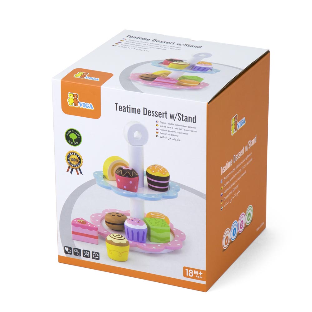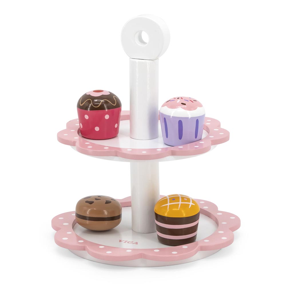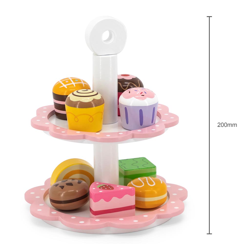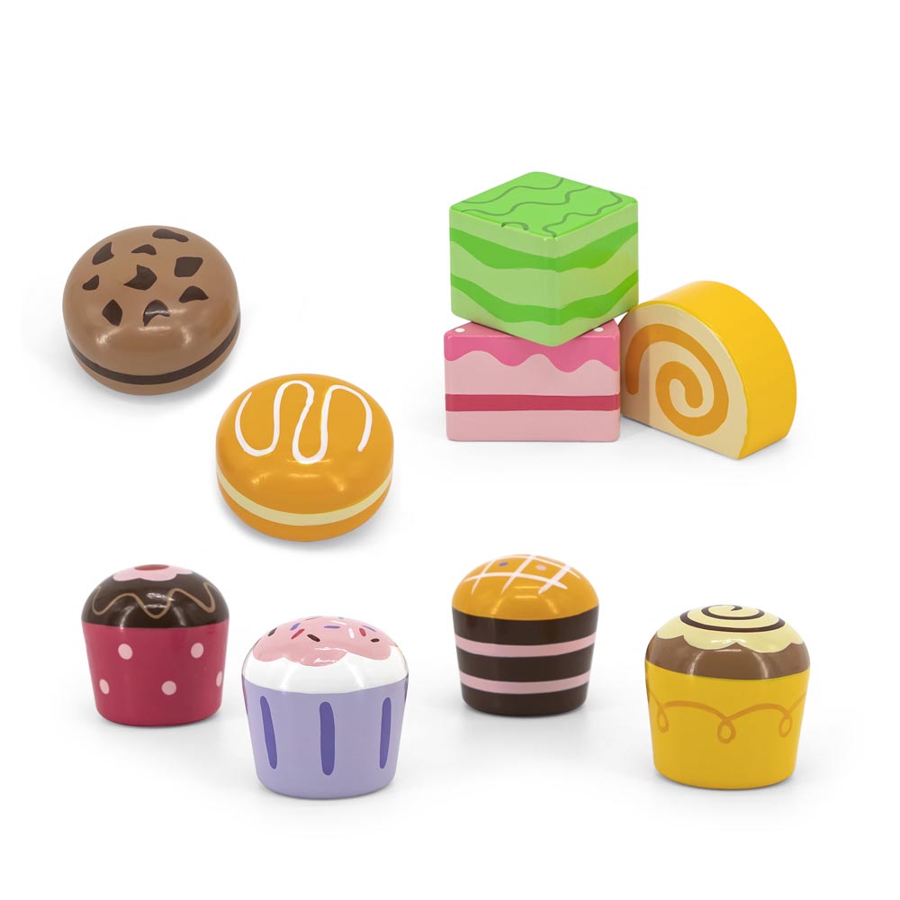 Hermoso y colorido set de postres para organizar la más linda reunión de muñecas y de amigas, todo de madera. Incluye: 9 pastelitos diferentes y bandeja doble.