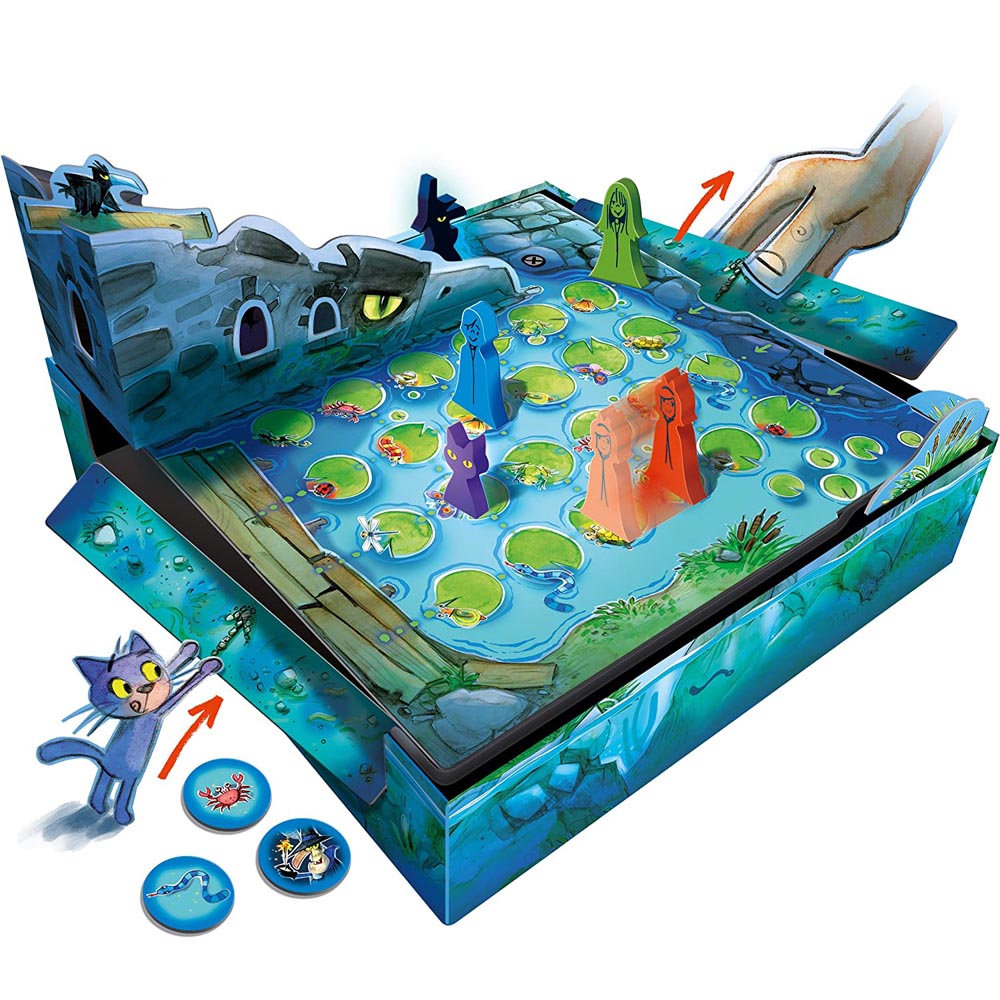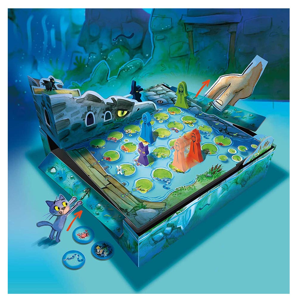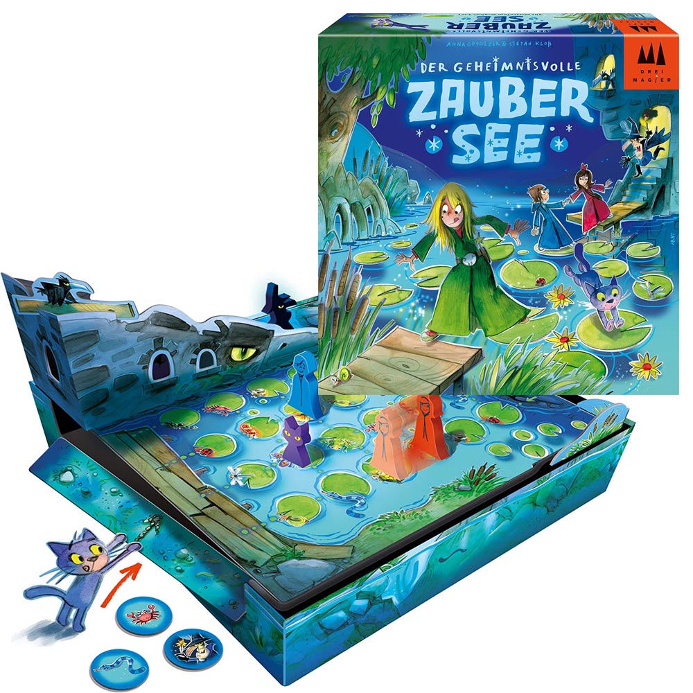 Los tres magos Conrad, Vicky y Mila salen corriendo del oscuro Castillo de Rabenfels para escapar del desagradable mago Rabenhorst. Pero en su escape, pasan por el lago mágico que no les permite huir y los devuelve al castillo… Consigue las cartas correctas juntas para liberar a los tres magos del misterioso hechizo. Solo como equipo puedes llegar a la orilla salvadora paso a paso y escapar del hechicero. Para jugar entre 2 y 5 jugadores.