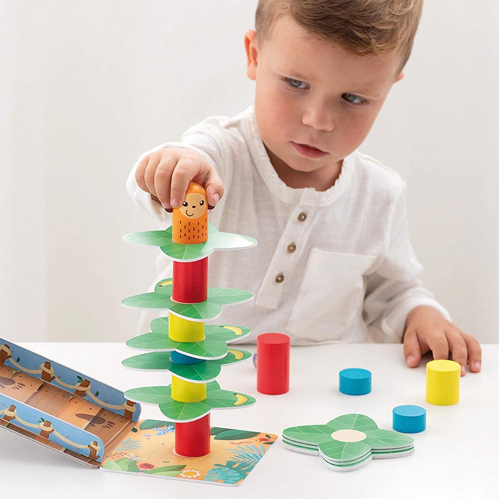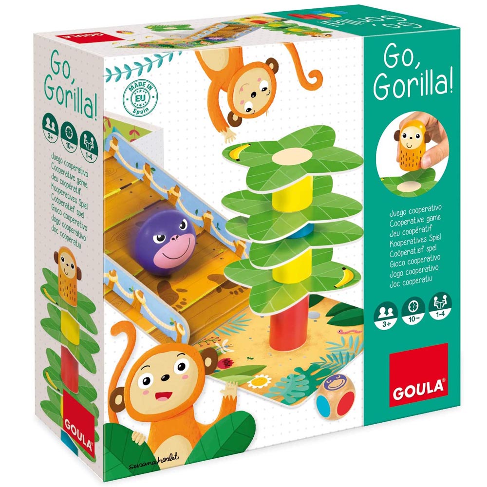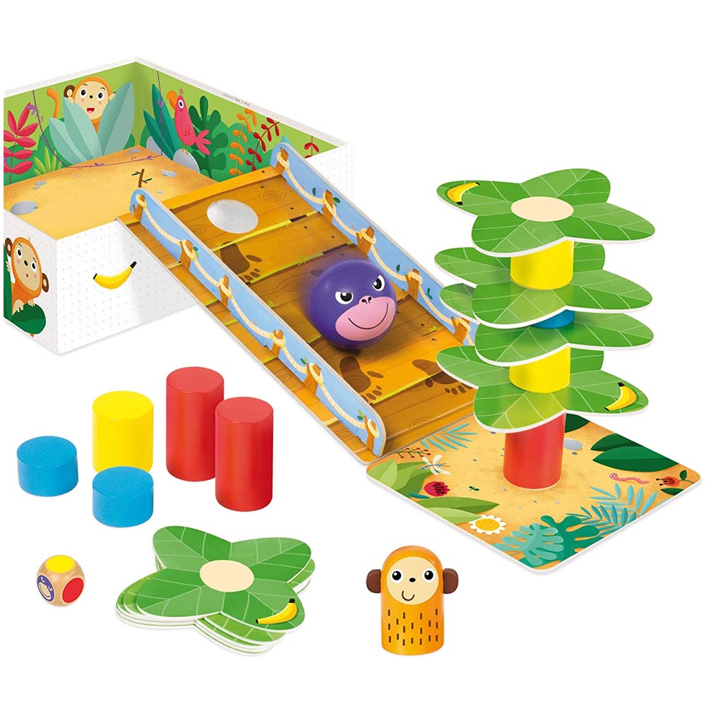Un divertido juego cooperativo y de equilibrio. Construye la palmera y coloca el mono en la parte superior ¡pero ten cuidado que no caiga! Desarrolla la coordinación mano-ojo y la motricidad fina. Recomendado para niños de más de 4 años. Incluye: 9 troncos de 3 alturas y colores diferentes, 1 mono, 1 gorila, 1 base, 1 rampa, 4 fichas de plátano, 9 hojas de palmera, 1 dado, instrucciones de juego.