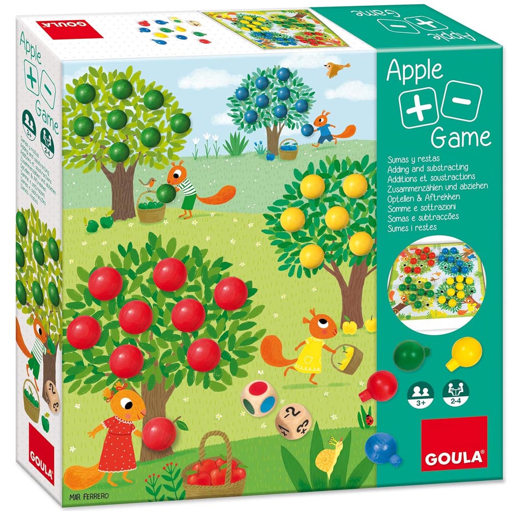 Juego educativo con 3 modos de juego. Coloca todas las manzanas de tu color en el árbol, sumando y restando. Contiene 1 tablero, 40 manzanas de madera, 1 dado de colores y 1 dado de números. Desarrolla la coordinación mano-ojo y la asociación del color e introduce el concepto de sumar y restar.