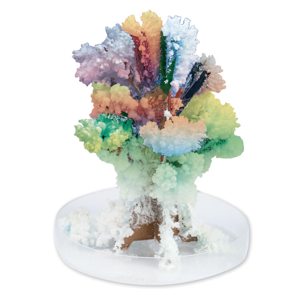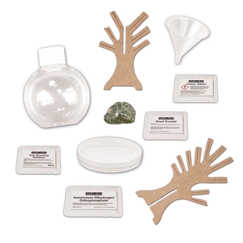 Descubre como se forman los cristales y cultiva un cristal espeluznante. Contiene ortofosfato de hidrogeno de amonio, solución para el cultivo de arboles, placa de petri, tableta de color, cristal de semillas, botella redonda, embudo, roca caliza y folleto informativo.