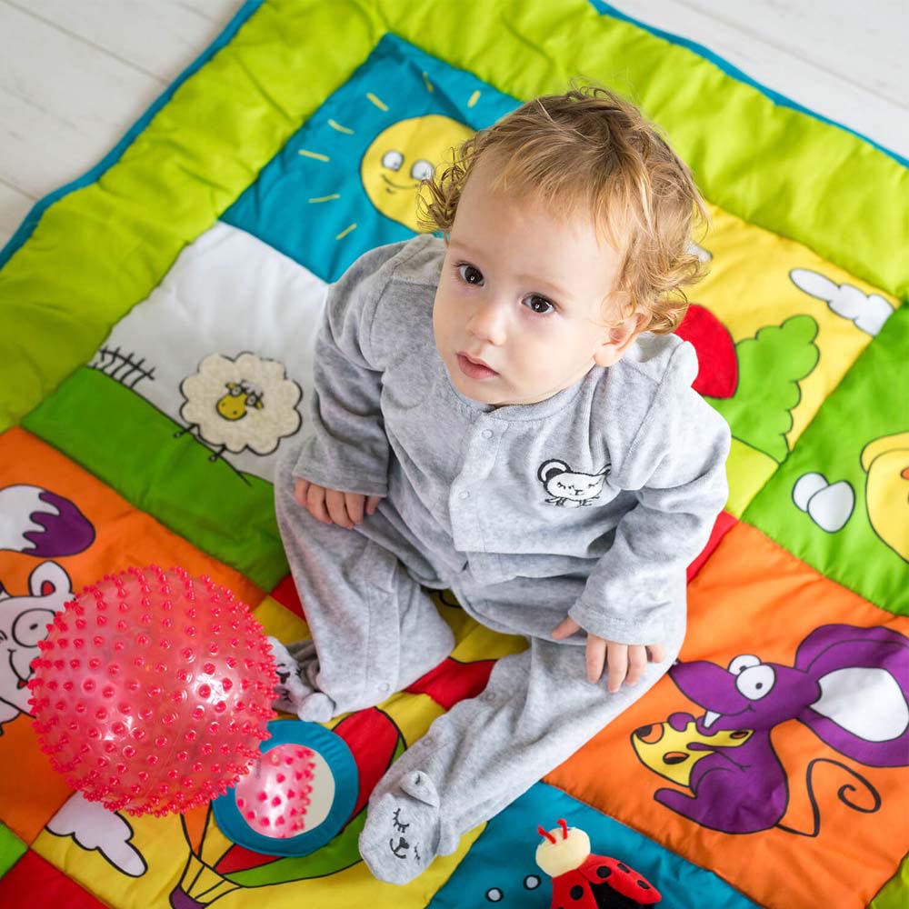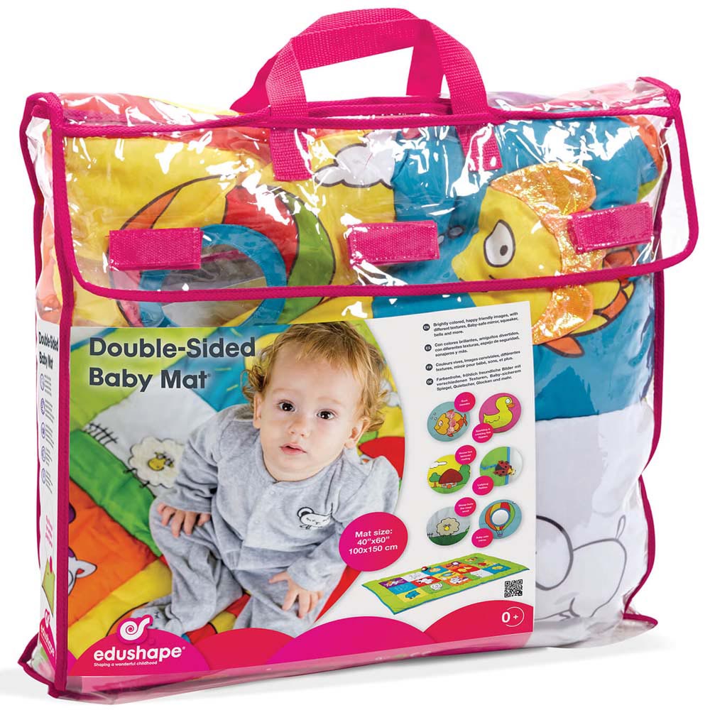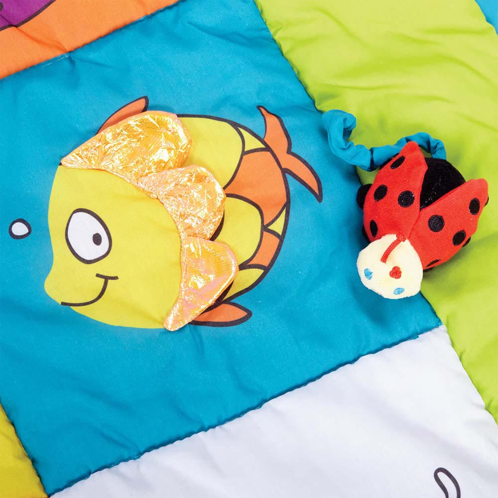 Esta enorme y suave alfombra para bebé cuenta con un lado para jugar, con imágenes coloridas y estimulantes, espejo para bebé, múltiples texturas y una mariquita atada. La otra cara es para calmar al bebé y solo muestra una foto de la amiga mariquita que se va a dormir. De material suave y resistente.