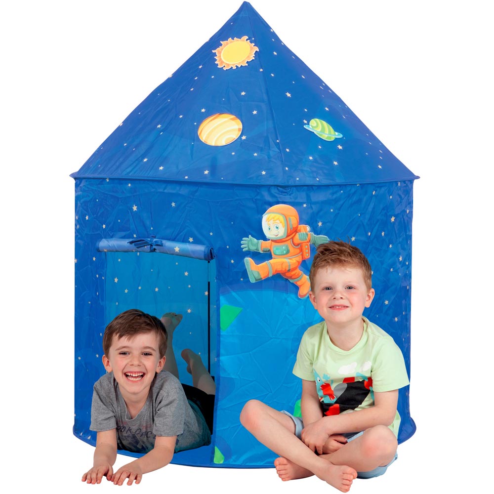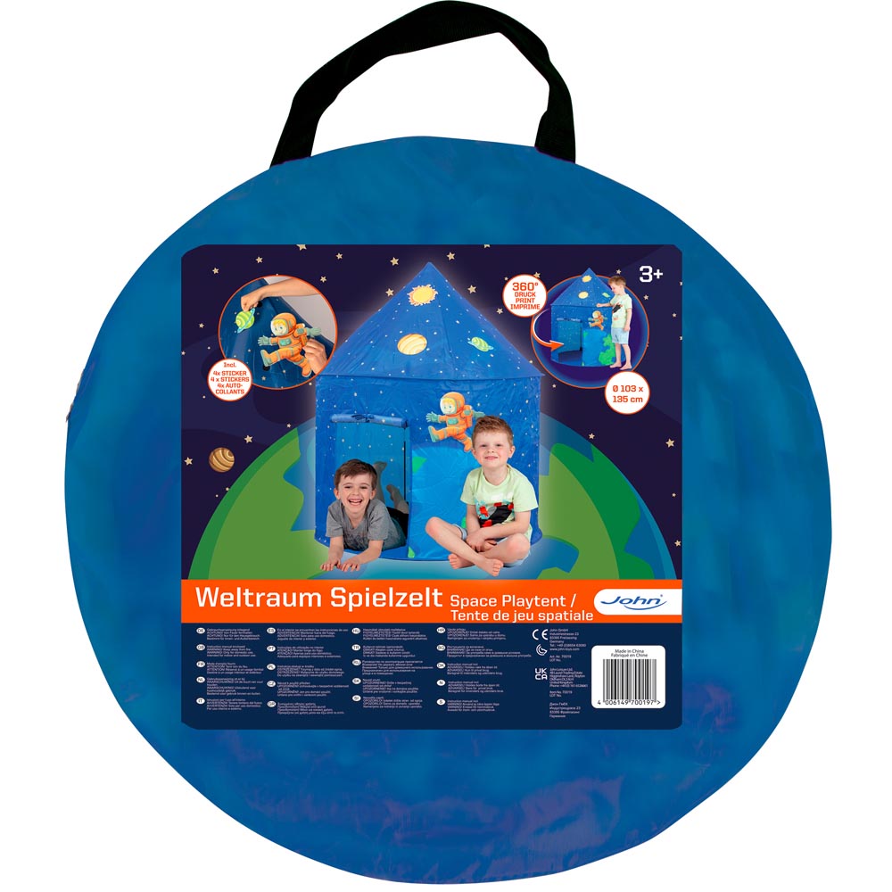 Hermosa carpa con diseño del espacio para llevar a todas partes y pasar horas de diversión jugando a acampar y viajar por el universo. Incluye 4 grandes stickers de decoración con velcro. De material suave y resistente y colores vivos.