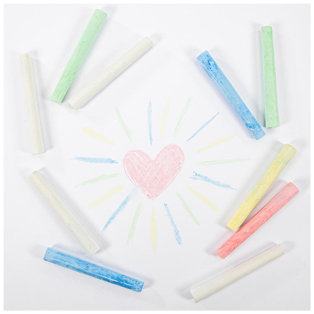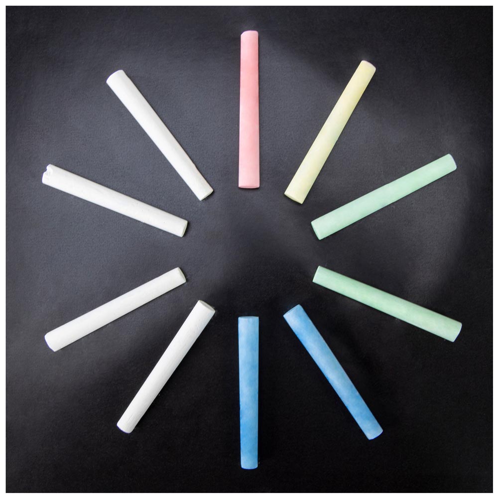 Pack de tizas de excelente calidad. No tóxicas. Incluye 4 blancos, 2 azules, 2 verdes, 1 amarillo y 1 rosa.